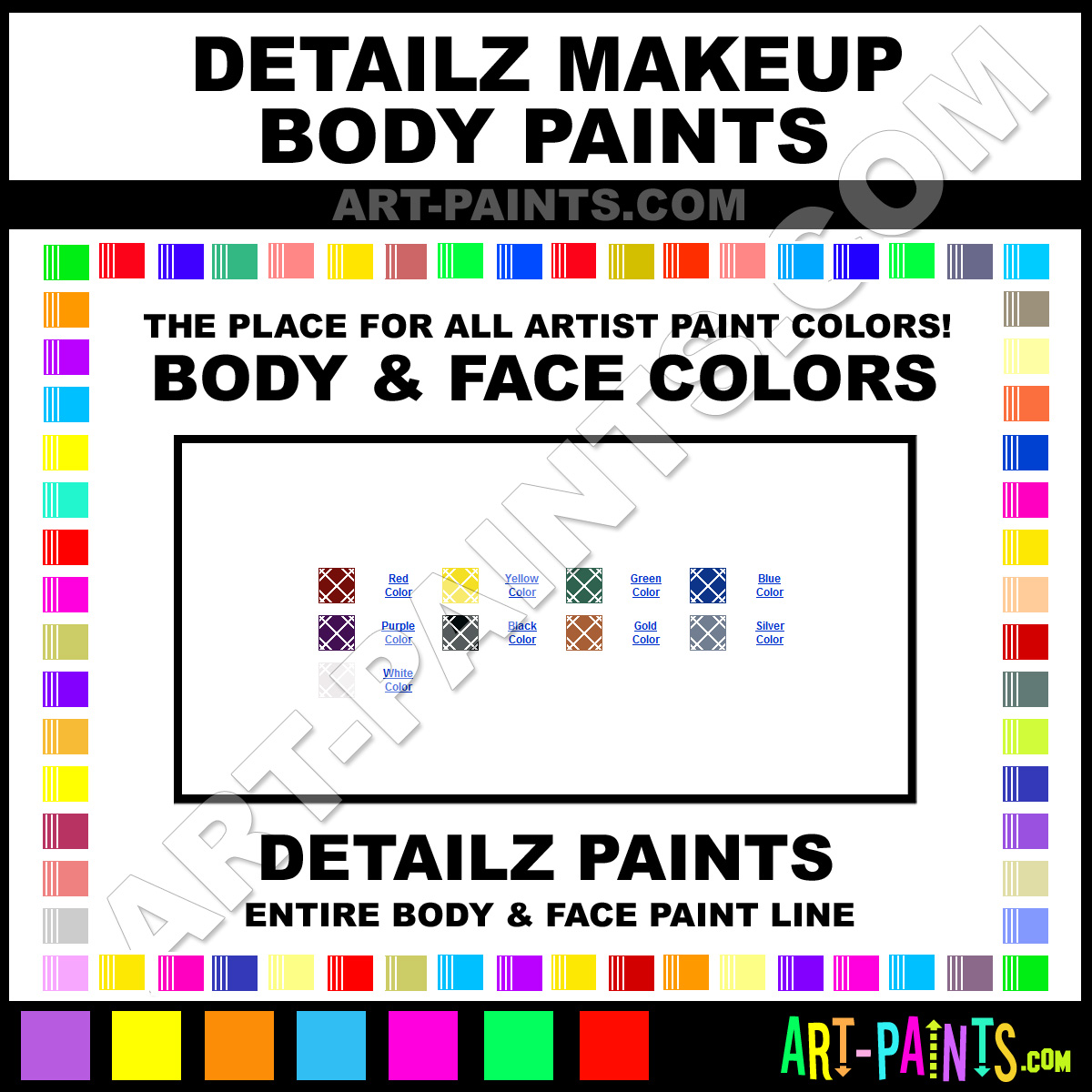 Detailz knows Body and Face Paints! They make a wonderful brand of paint called Detailz Makeup Body Colors that suits all types of artists, whether they deal with Face Makeup, Body Paints, Stage and Theater Paint or even Clown Paints! They strive to perfect the process of color and are one of the most popular Body Paint Brand companies in the world. Enjoy their entire paint brand collection from the list below. Detailz makes wonderful Artists Body and Face Paints that everyone is sure to enjoy! Choose an Body Paint Color below to view that Hue and all their great related color paints. Paint on!     -Art-Paints.com