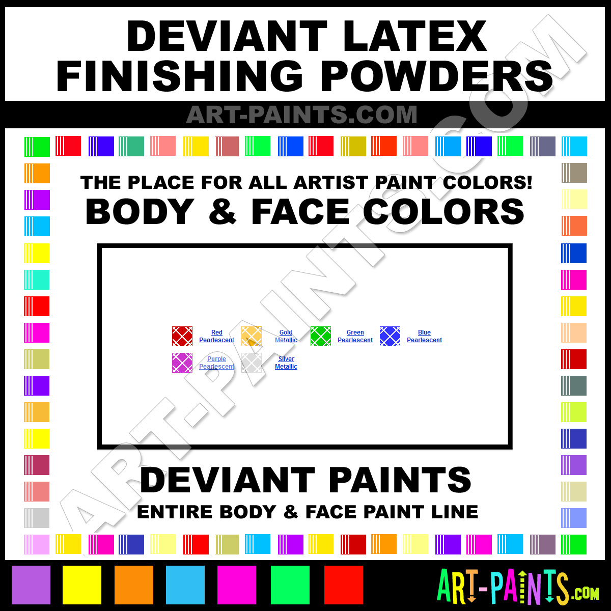 Deviant knows Body and Face Paints! They make a wonderful brand of paint called Deviant Latex Finishing Powder Body Colors that suits all types of artists, whether they deal with Face Makeup, Body Paints, Stage and Theater Paint or even Clown Paints! They strive to perfect the process of color and are one of the most popular Body Paint Brand companies in the world. Enjoy their entire paint brand collection from the list below. Deviant makes wonderful Artists Body and Face Paints that everyone is sure to enjoy! Choose an Body Paint Color below to view that Hue and all their great related color paints. Paint on!     -Art-Paints.com