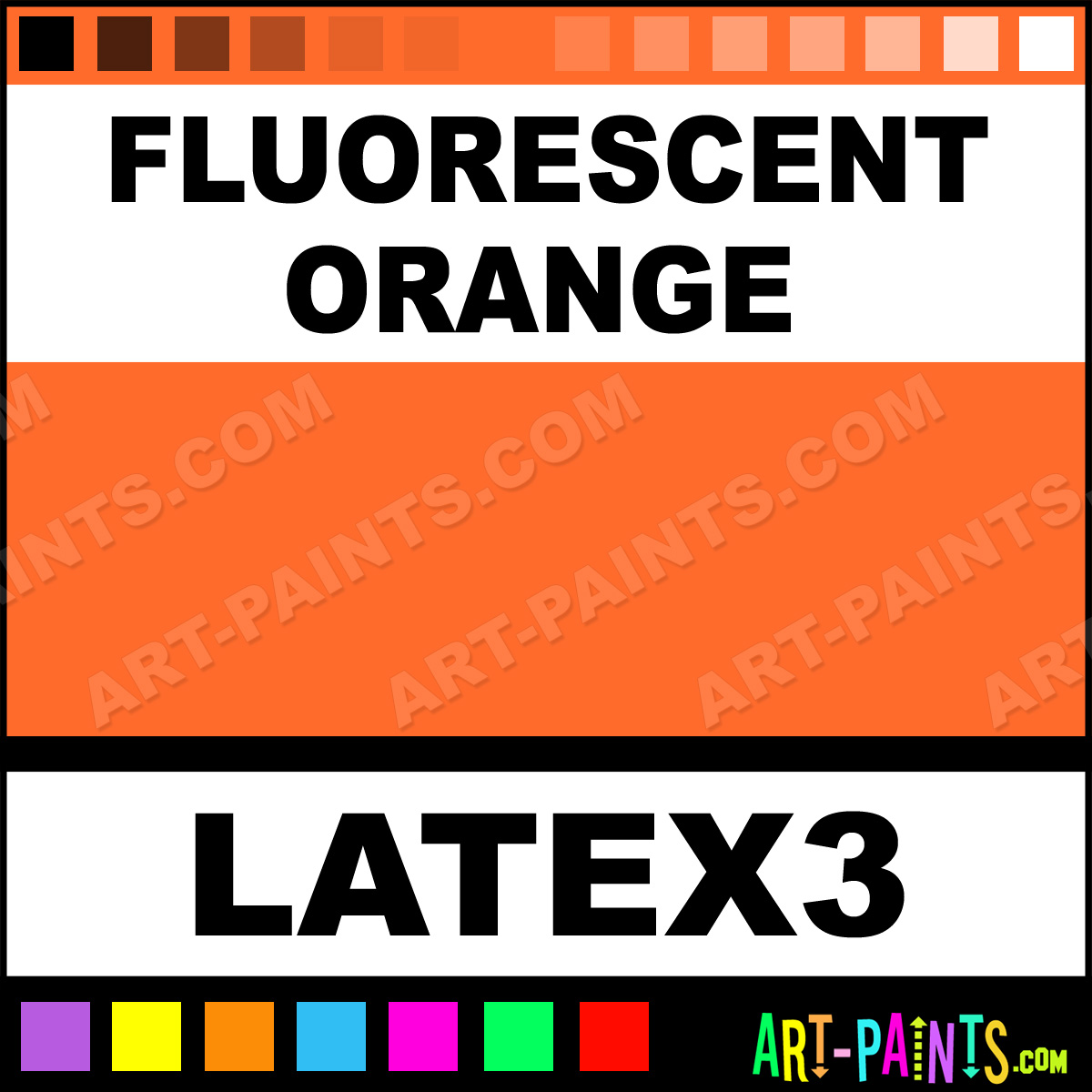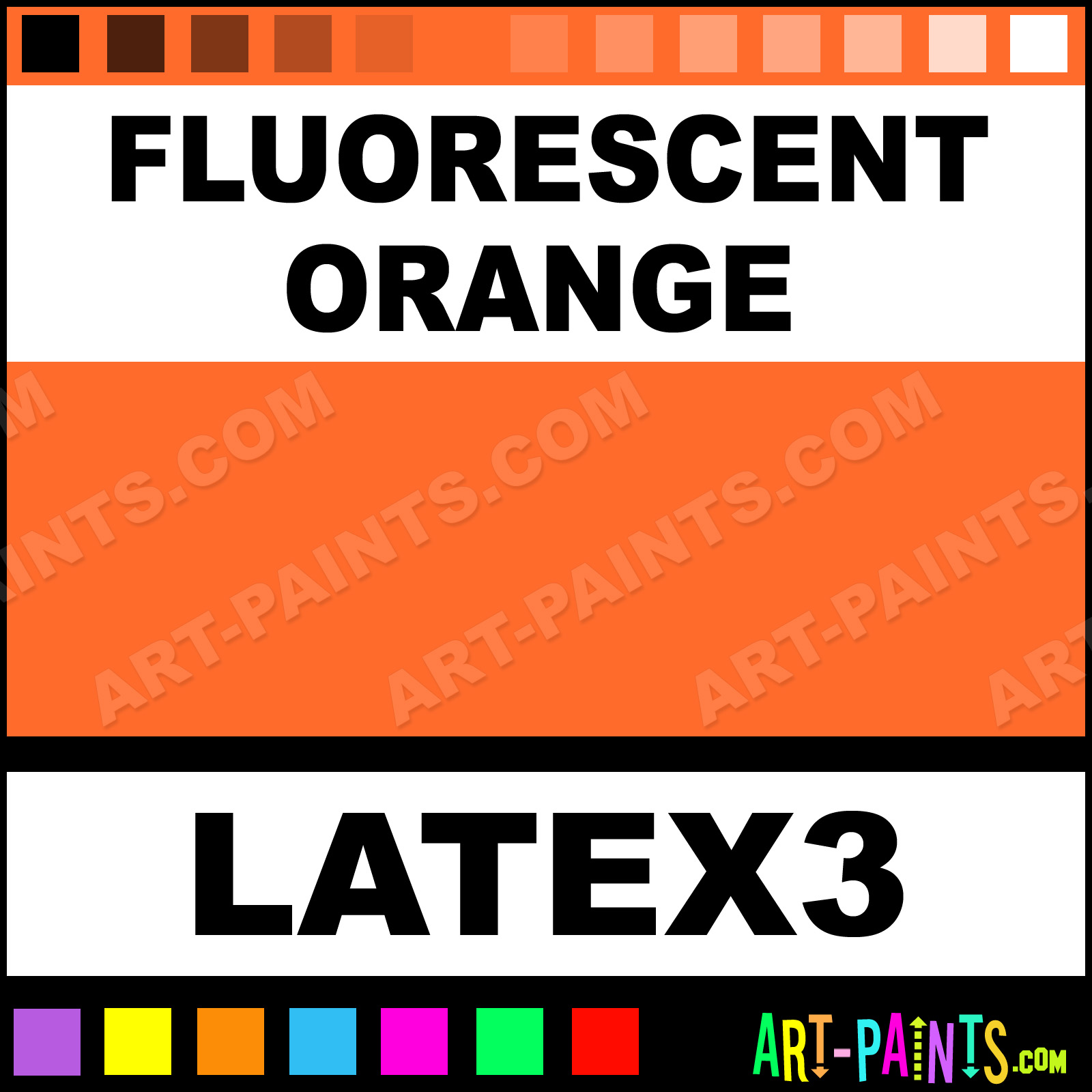 This beautiful Liquid Latex Body Face shade is called Fluorescent Orange, and comes from a company called Deviant. Their product number, along with the HTML color code, RGB, and CMYK codes are listed below. This Beautiful Shade of Fluorescent Orange and others can be found in the Deviant Liquid Latex Art Paint Gallery! Also be sure to browse through the other wonderful Professional Color Galleries of Face Paint, Makeup, Stage, Theater and Clown Paints to see more of Deviant Liquid Latex Body Brand Paints and other Body and Face Paint Manufacturers. And as always, Paint Paint Paint! -Art-Paints.com