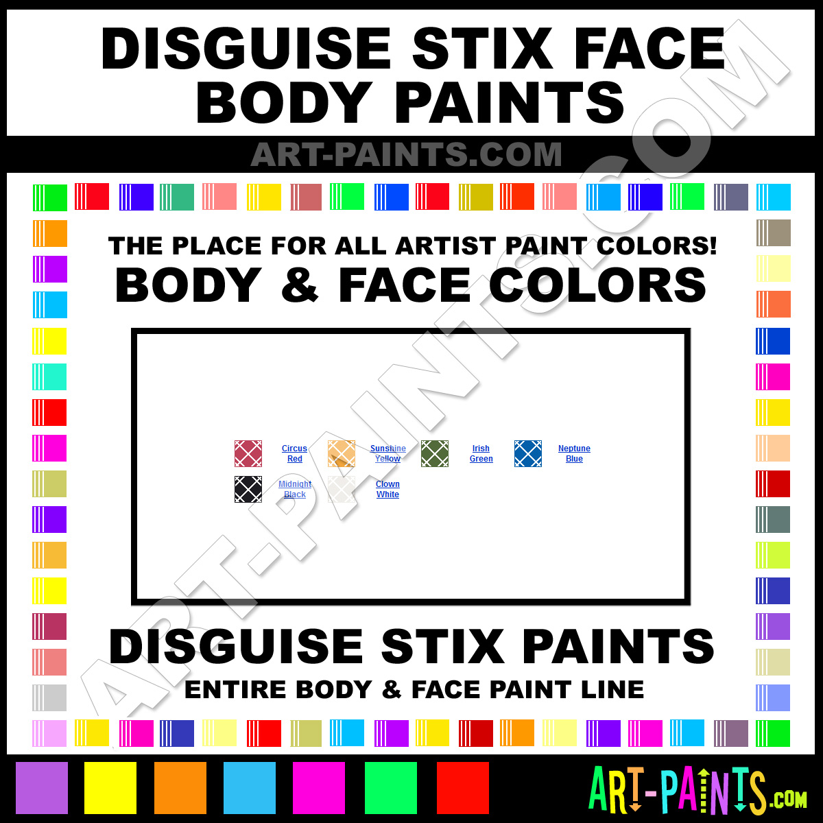 Disguise Stix knows Body and Face Paints! They make a wonderful brand of paint called Disguise Stix Face Body Colors that suits all types of artists, whether they deal with Face Makeup, Body Paints, Stage and Theater Paint or even Clown Paints! They strive to perfect the process of color and are one of the most popular Body Paint Brand companies in the world. Enjoy their entire paint brand collection from the list below. Disguise Stix makes wonderful Artists Body and Face Paints that everyone is sure to enjoy! Choose an Body Paint Color below to view that Hue and all their great related color paints. Paint on!     -Art-Paints.com