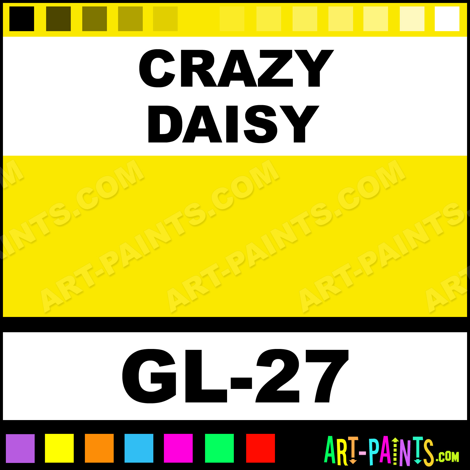 This beautiful Cosmetic Glitter Body Face shade is called Crazy Daisy, and comes from a company called GRL. Their product number, along with the HTML color code, RGB, and CMYK codes are listed below. This Beautiful Shade of Crazy Daisy and others can be found in the GRL Cosmetic Glitter Art Paint Gallery! Also be sure to browse through the other wonderful Professional Color Galleries of Face Paint, Makeup, Stage, Theater and Clown Paints to see more of GRL Cosmetic Glitter Body Brand Paints and other Body and Face Paint Manufacturers. And as always, Paint Paint Paint! -Art-Paints.com