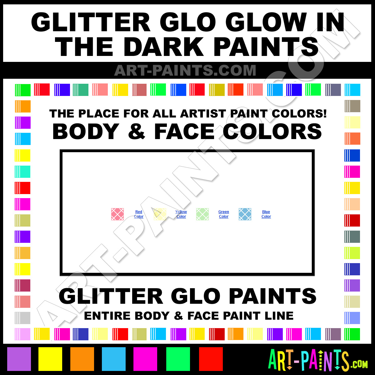 Glitter Glo knows Body and Face Paints! They make a wonderful brand of paint called Glitter Glo Glow In Dark Body Colors that suits all types of artists, whether they deal with Face Makeup, Body Paints, Stage and Theater Paint or even Clown Paints! They strive to perfect the process of color and are one of the most popular Body Paint Brand companies in the world. Enjoy their entire paint brand collection from the list below. Glitter Glo makes wonderful Artists Body and Face Paints that everyone is sure to enjoy! Choose an Body Paint Color below to view that Hue and all their great related color paints. Paint on!     -Art-Paints.com