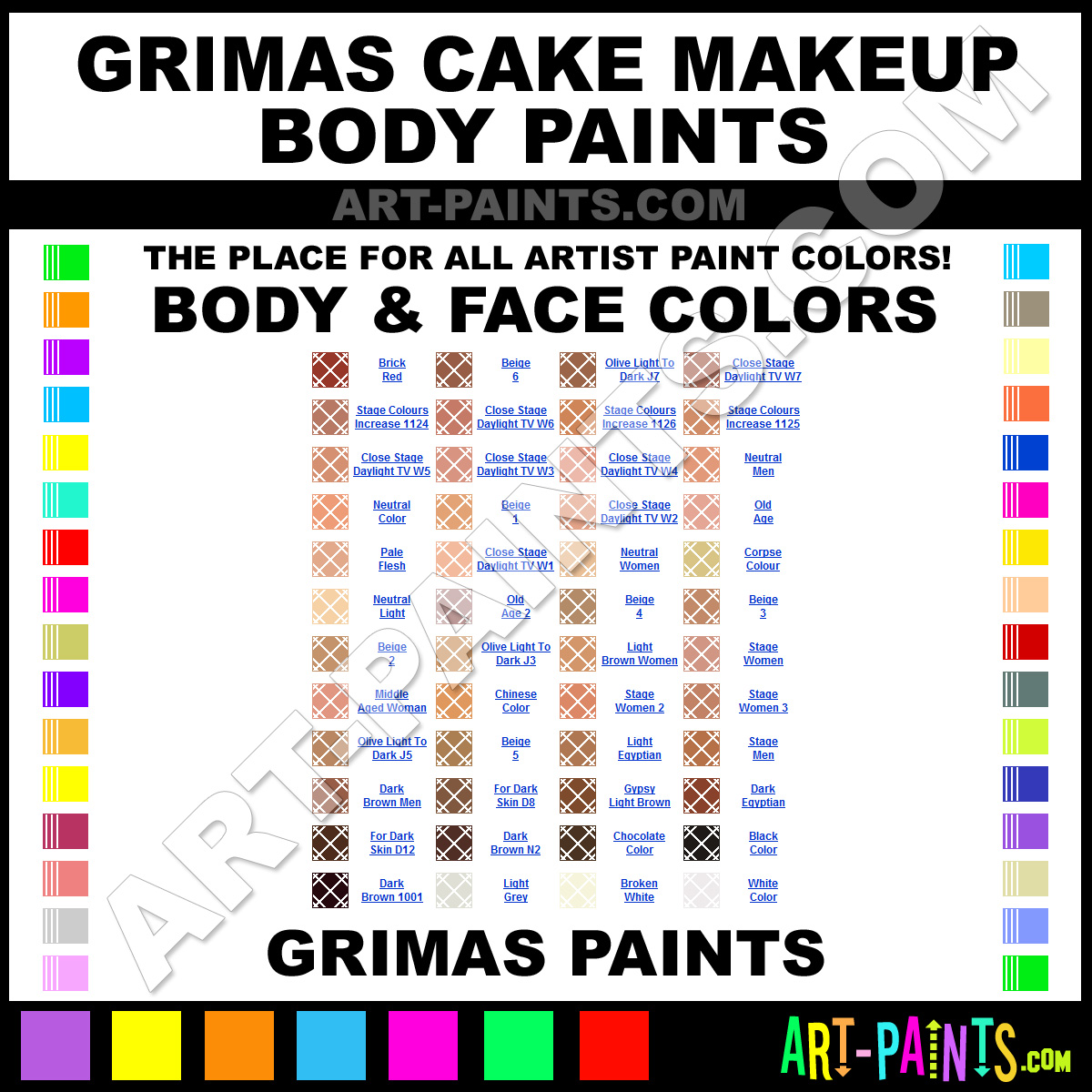 Grimas knows Body and Face Paints! They make a wonderful brand of paint called Grimas Cake Makeup Body Colors that suits all types of artists, whether they deal with Face Makeup, Body Paints, Stage and Theater Paint or even Clown Paints! They strive to perfect the process of color and are one of the most popular Body Paint Brand companies in the world. Enjoy their entire paint brand collection from the list below. Grimas makes wonderful Artists Body and Face Paints that everyone is sure to enjoy! Choose an Body Paint Color below to view that Hue and all their great related color paints. Paint on!     -Art-Paints.com