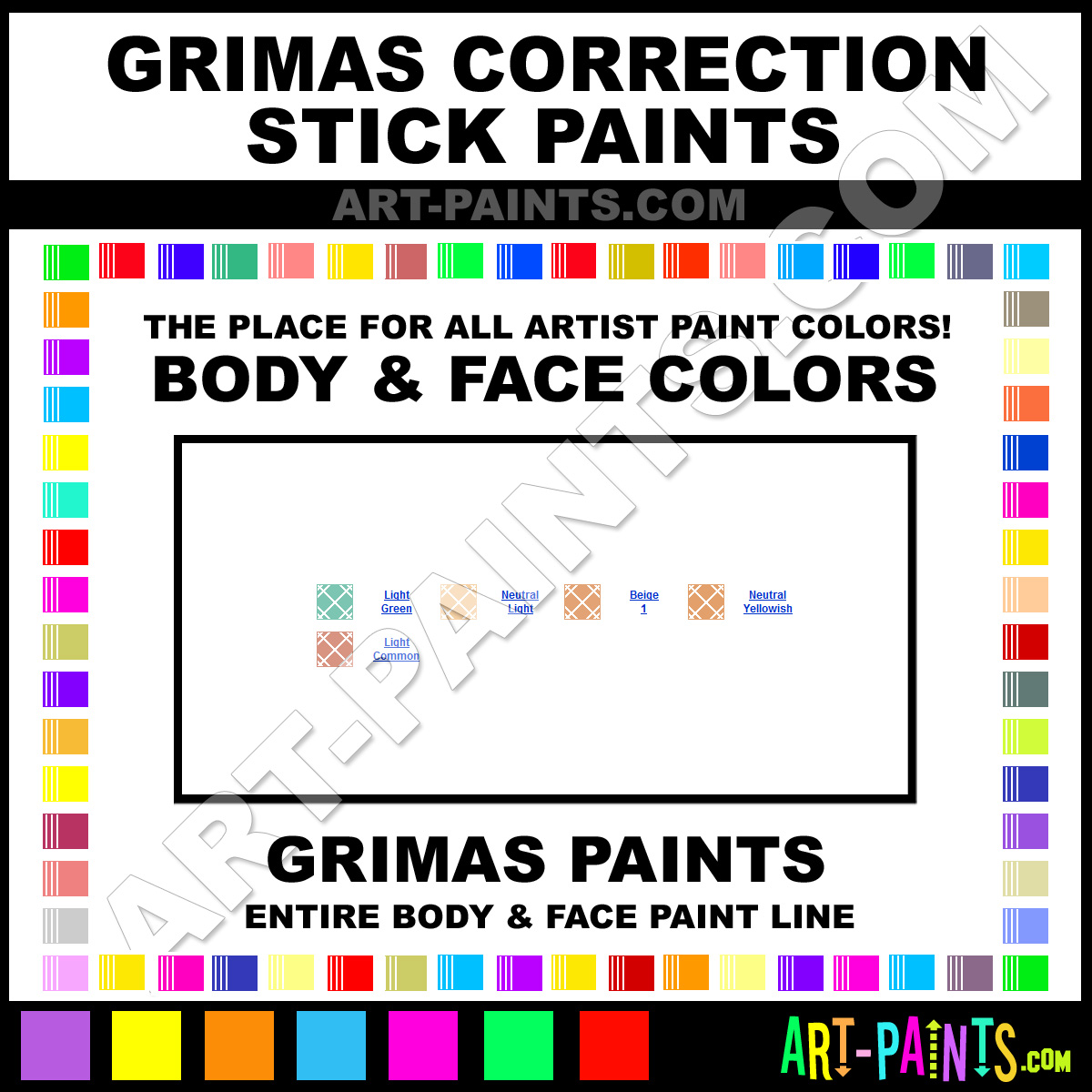 Grimas knows Body and Face Paints! They make a wonderful brand of paint called Grimas Correction Stick Body Colors that suits all types of artists, whether they deal with Face Makeup, Body Paints, Stage and Theater Paint or even Clown Paints! They strive to perfect the process of color and are one of the most popular Body Paint Brand companies in the world. Enjoy their entire paint brand collection from the list below. Grimas makes wonderful Artists Body and Face Paints that everyone is sure to enjoy! Choose an Body Paint Color below to view that Hue and all their great related color paints. Paint on!     -Art-Paints.com