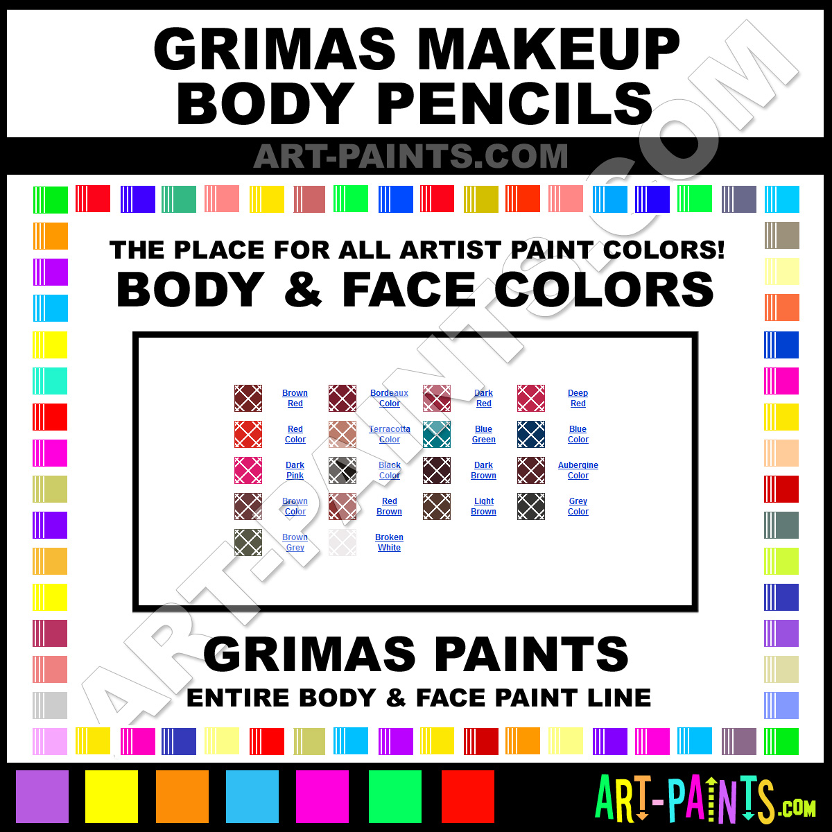 Grimas knows Body and Face Paints! They make a wonderful brand of paint called Grimas Makeup Pencil Body Colors that suits all types of artists, whether they deal with Face Makeup, Body Paints, Stage and Theater Paint or even Clown Paints! They strive to perfect the process of color and are one of the most popular Body Paint Brand companies in the world. Enjoy their entire paint brand collection from the list below. Grimas makes wonderful Artists Body and Face Paints that everyone is sure to enjoy! Choose an Body Paint Color below to view that Hue and all their great related color paints. Paint on!     -Art-Paints.com