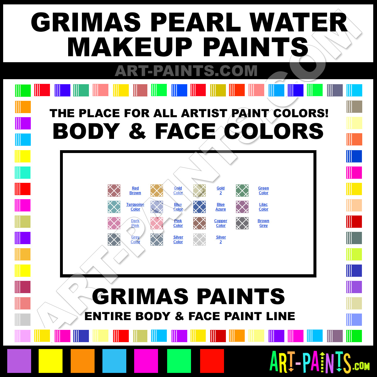 Grimas knows Body and Face Paints! They make a wonderful brand of paint called Grimas Pearl Water Makeup Body Colors that suits all types of artists, whether they deal with Face Makeup, Body Paints, Stage and Theater Paint or even Clown Paints! They strive to perfect the process of color and are one of the most popular Body Paint Brand companies in the world. Enjoy their entire paint brand collection from the list below. Grimas makes wonderful Artists Body and Face Paints that everyone is sure to enjoy! Choose an Body Paint Color below to view that Hue and all their great related color paints. Paint on!     -Art-Paints.com
