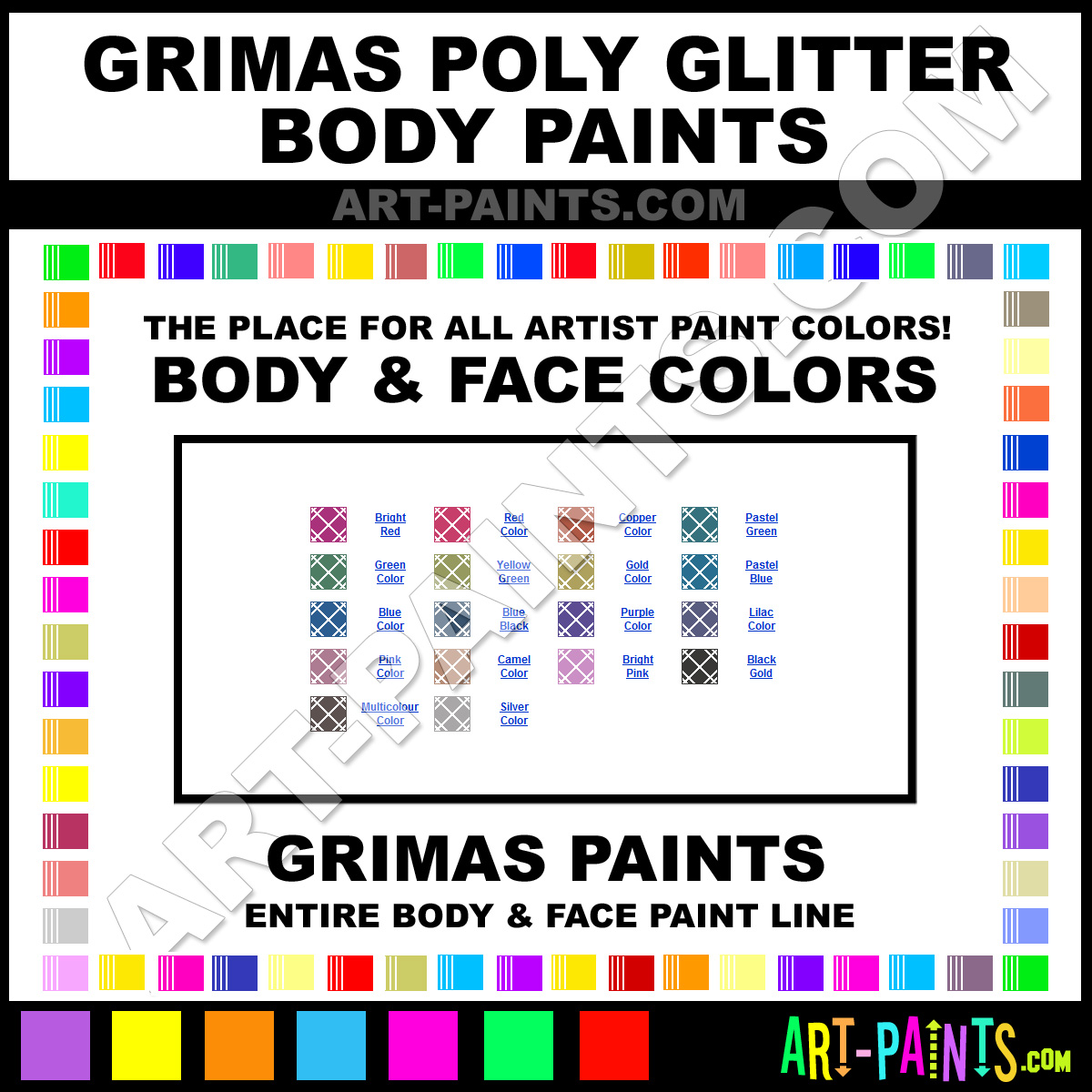 Grimas makes a beautiful Poly Glitter Paint Brand. With a complete line of Body and Face Color Paints, 18 colors in all, available in beautiful hues and colors, they will no doubt keep you painting and smiling at the same time. This brand is very unique and exquisite!