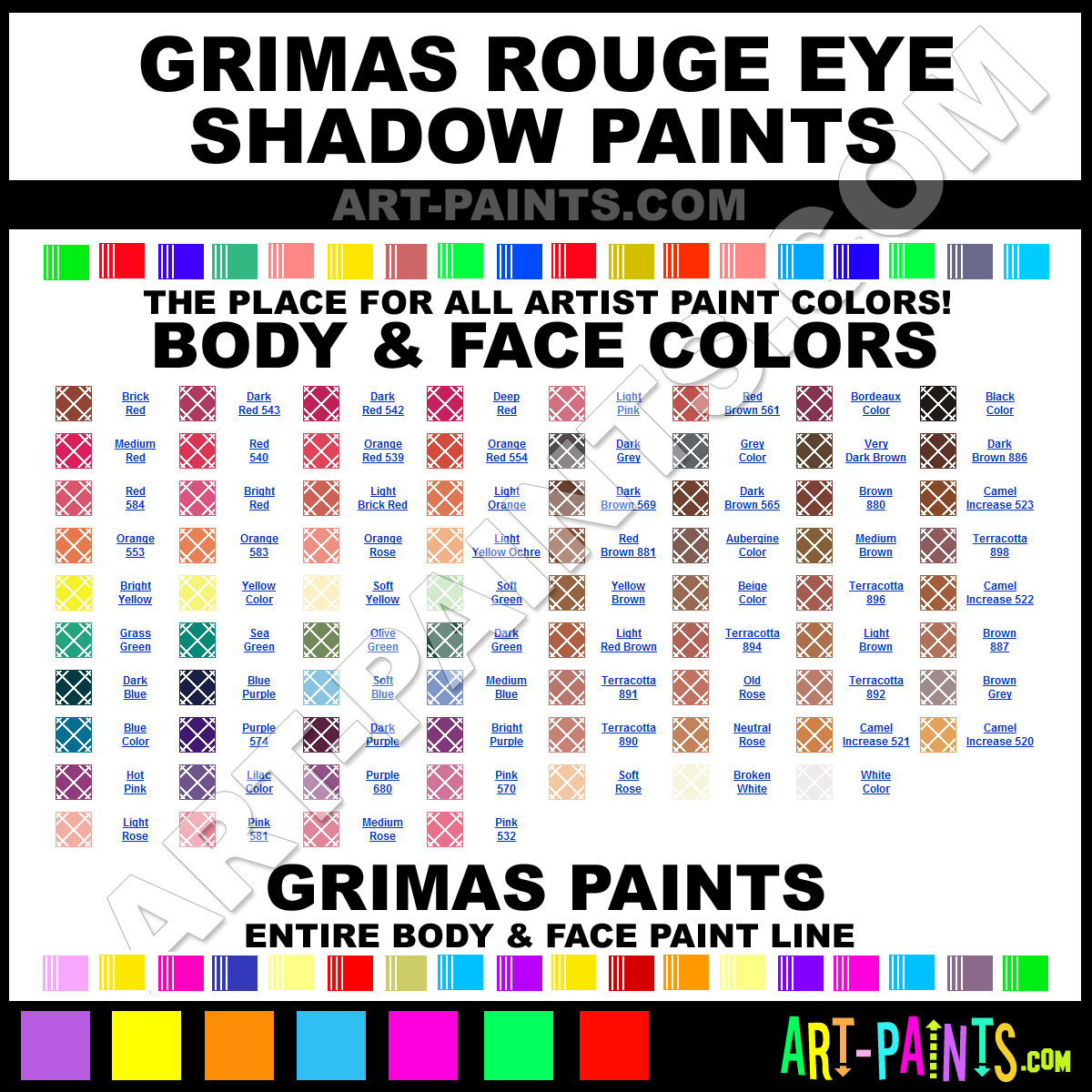 Grimas knows Body and Face Paints! They make a wonderful brand of paint called Grimas Rouge Eye Shadow Body Colors that suits all types of artists, whether they deal with Face Makeup, Body Paints, Stage and Theater Paint or even Clown Paints! They strive to perfect the process of color and are one of the most popular Body Paint Brand companies in the world. Enjoy their entire paint brand collection from the list below. Grimas makes wonderful Artists Body and Face Paints that everyone is sure to enjoy! Choose an Body Paint Color below to view that Hue and all their great related color paints. Paint on!     -Art-Paints.com