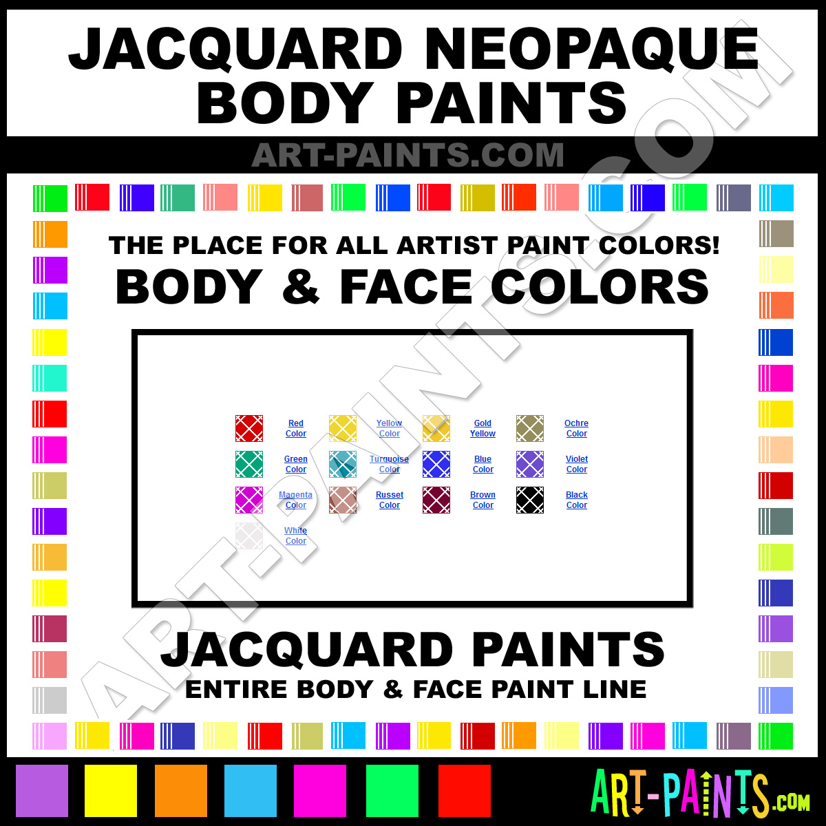 Jacquard knows Body and Face Paints! They make a wonderful brand of paint called Jacquard Neopaque Body Colors that suits all types of artists, whether they deal with Face Makeup, Body Paints, Stage and Theater Paint or even Clown Paints! They strive to perfect the process of color and are one of the most popular Body Paint Brand companies in the world. Enjoy their entire paint brand collection from the list below. Jacquard makes wonderful Artists Body and Face Paints that everyone is sure to enjoy! Choose an Body Paint Color below to view that Hue and all their great related color paints. Paint on!     -Art-Paints.com