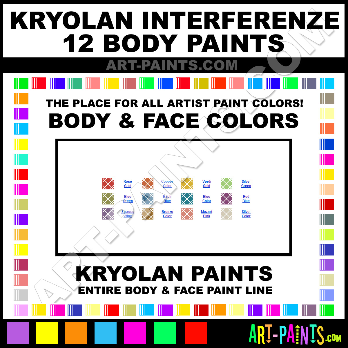 Kryolan makes a beautiful Interferenze 12 Paint Brand. With a complete line of Body and Face Color Paints, 12 colors in all, available in beautiful hues and colors, they will no doubt keep you painting and smiling at the same time. This brand is very unique and exquisite!