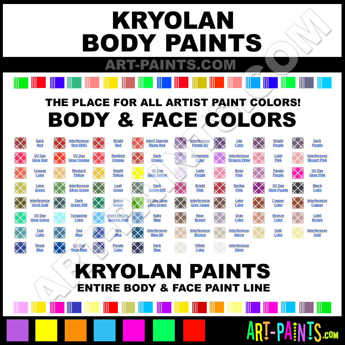 Kryolan knows Body and Face Paints! They make wonderful brands of paint for all types of artists. They strive to perfect the process of color and are one of the most popular Body Paint Brand companies in the world. Enjoy their entire brand collection from the list below. Kryolan makes a couple different types of Face and Body Paint Brands including its Aquacolor 12, Aquacolor 24, UV Day Glow Paints, Fluorescent Paints, Color Glitter Powder, Interferenze 12 Paints, Metallic Paints, Paints and Primary Palette Paints! Choose an Body Paint type below to view that brand and all the related Color Paints, Hues for any Stage, Theatre, Make-Up, or Clown use. Paint on!     -Art-Paints.com