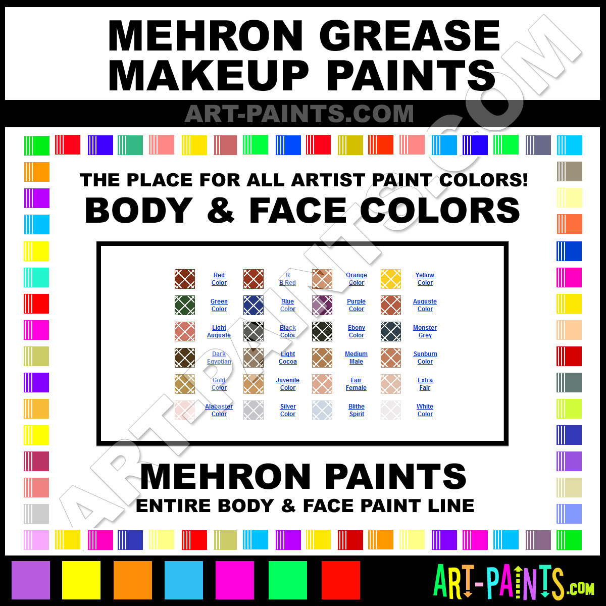 Mehron knows Body and Face Paints! They make a wonderful brand of paint called Mehron Grease Makeup Body Colors that suits all types of artists, whether they deal with Face Makeup, Body Paints, Stage and Theater Paint or even Clown Paints! They strive to perfect the process of color and are one of the most popular Body Paint Brand companies in the world. Enjoy their entire paint brand collection from the list below. Mehron makes wonderful Artists Body and Face Paints that everyone is sure to enjoy! Choose an Body Paint Color below to view that Hue and all their great related color paints. Paint on!     -Art-Paints.com