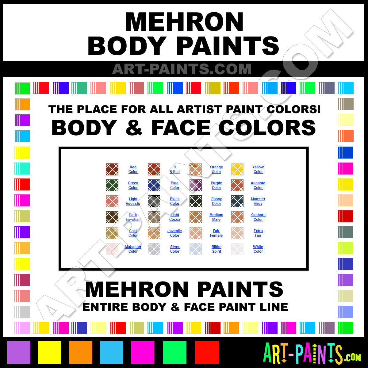 Mehron knows Body and Face Paints! They make wonderful brands of paint for all types of artists. They strive to perfect the process of color and are one of the most popular Body Paint Brand companies in the world. Enjoy their entire brand collection from the list below. Mehron makes a couple different types of Face and Body Paint Brands including its FX Makeup Paints, Grease Makeup Paints, Tooth FX Paints and Pro-Pencil Paints! Choose an Body Paint type below to view that brand and all the related Color Paints, Hues for any Stage, Theatre, Make-Up, or Clown use. Paint on!     -Art-Paints.com