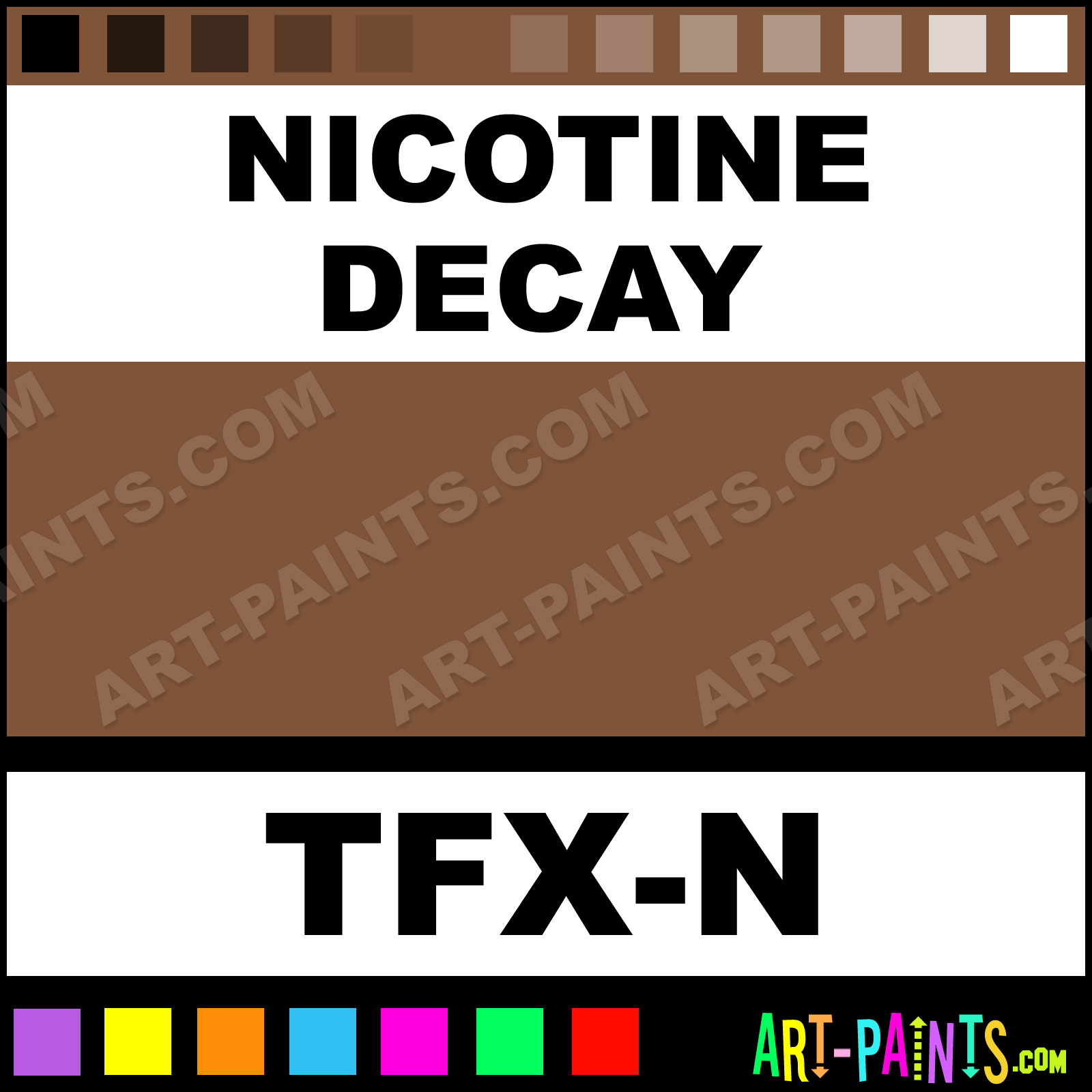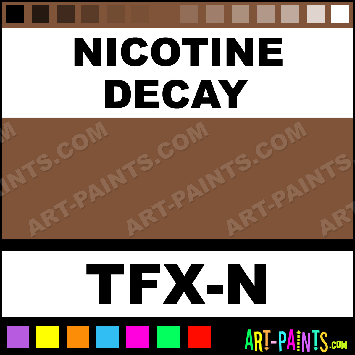 This beautiful Tooth F-X Body Face shade is called Nicotine Decay, and comes from a company called Mehron. Their product number, along with the HTML color code, RGB, and CMYK codes are listed below. This Beautiful Shade of Nicotine Decay and others can be found in the Mehron Tooth F-X Art Paint Gallery! Also be sure to browse through the other wonderful Professional Color Galleries of Face Paint, Makeup, Stage, Theater and Clown Paints to see more of Mehron Tooth F-X Body Brand Paints and other Body and Face Paint Manufacturers. And as always, Paint Paint Paint! -Art-Paints.com