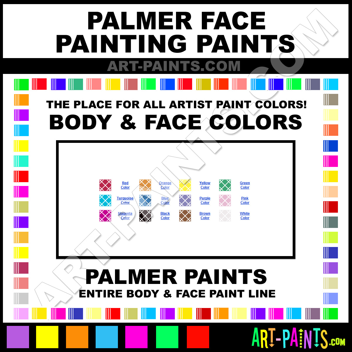 Palmer knows Body and Face Paints! They make a wonderful brand of paint called Palmer Face Paints Body Colors that suits all types of artists, whether they deal with Face Makeup, Body Paints, Stage and Theater Paint or even Clown Paints! They strive to perfect the process of color and are one of the most popular Body Paint Brand companies in the world. Enjoy their entire paint brand collection from the list below. Palmer makes wonderful Artists Body and Face Paints that everyone is sure to enjoy! Choose an Body Paint Color below to view that Hue and all their great related color paints. Paint on!     -Art-Paints.com