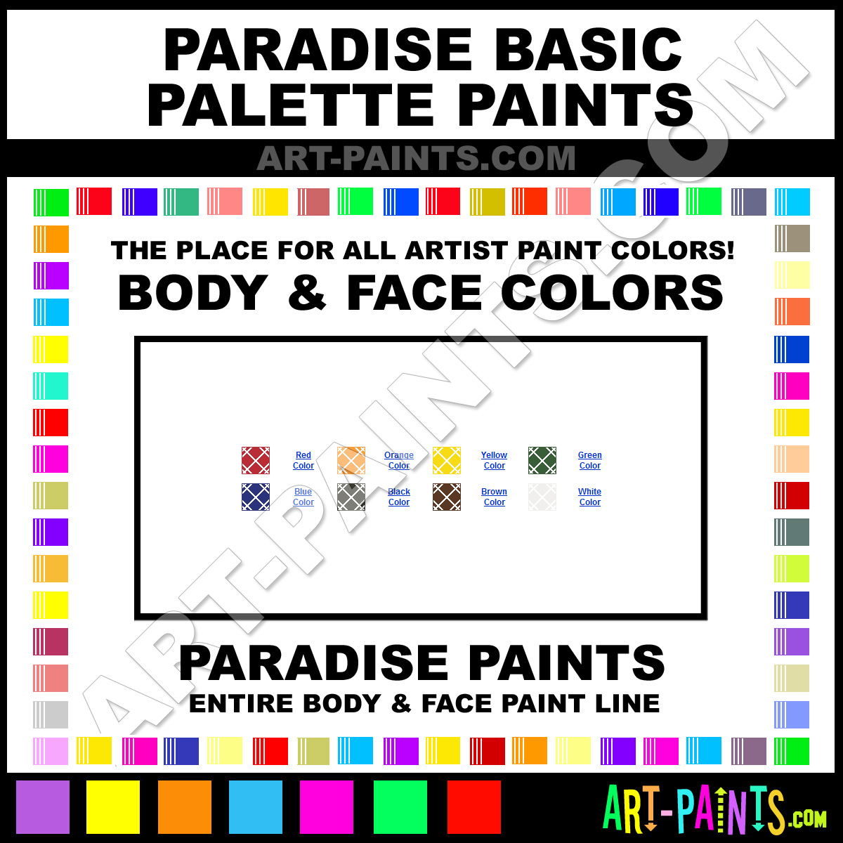 Paradise makes a beautiful Basic Palette Paint Brand. With a complete line of Body and Face Color Paints, 8 colors in all, available in beautiful hues and colors, they will no doubt keep you painting and smiling at the same time. This brand is very unique and exquisite!