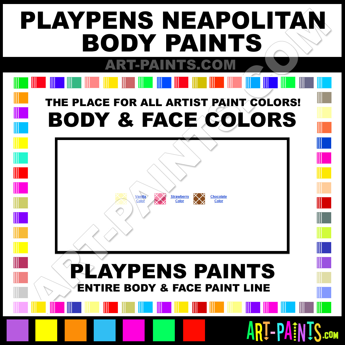 PlayPens makes a beautiful Neapolitan Paint Brand. With a complete line of Body and Face Color Paints, 3 colors in all, available in beautiful hues and colors, they will no doubt keep you painting and smiling at the same time. This brand is very unique and exquisite!