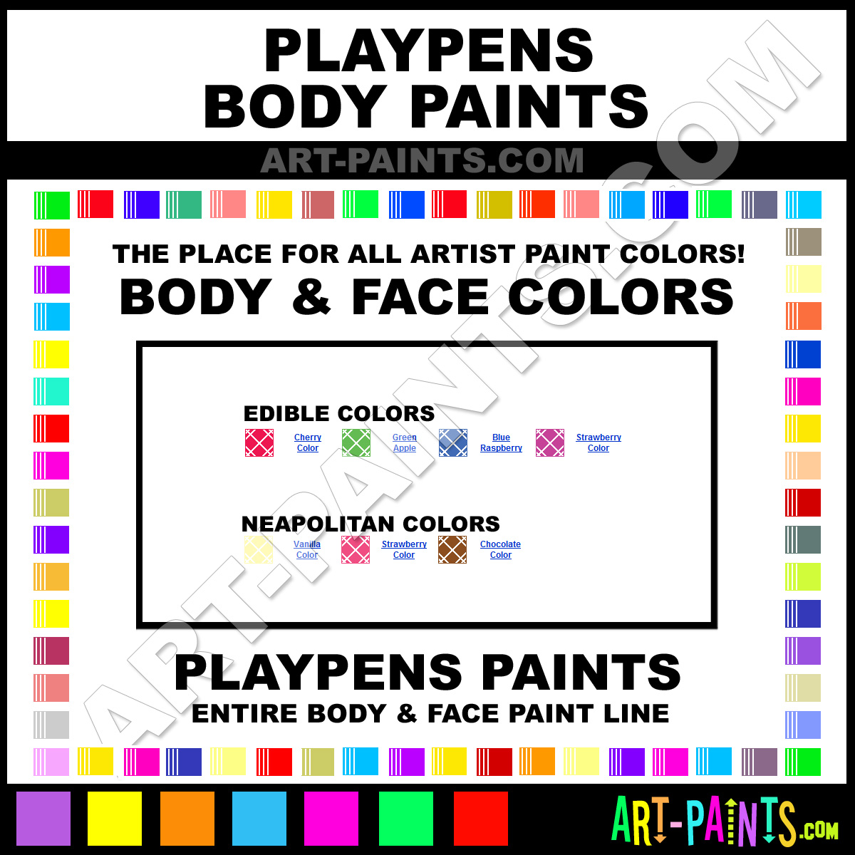 PlayPens knows Body and Face Paints! They make wonderful brands of paint for all types of artists. They strive to perfect the process of color and are one of the most popular Body Paint Brand companies in the world. Enjoy their entire brand collection from the list below. PlayPens makes a couple different types of Face and Body Paint Brands including its Edible Paints and its Neapolitan Paints! Choose an Body Paint type below to view that brand and all the related Color Paints, Hues for any Stage, Theatre, Make-Up, or Clown use. Paint on!     -Art-Paints.com