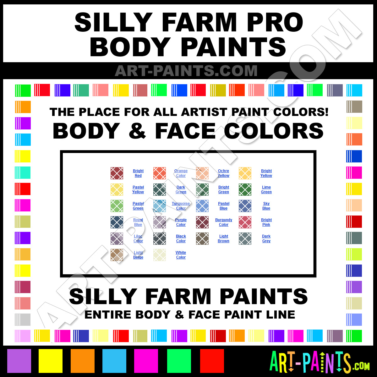 Silly Farm knows Body and Face Paints! They make a wonderful brand of paint called Silly Farm Professional Body Colors that suits all types of artists, whether they deal with Face Makeup, Body Paints, Stage and Theater Paint or even Clown Paints! They strive to perfect the process of color and are one of the most popular Body Paint Brand companies in the world. Enjoy their entire paint brand collection from the list below. Silly Farm makes wonderful Artists Body and Face Paints that everyone is sure to enjoy! Choose an Body Paint Color below to view that Hue and all their great related color paints. Paint on!     -Art-Paints.com