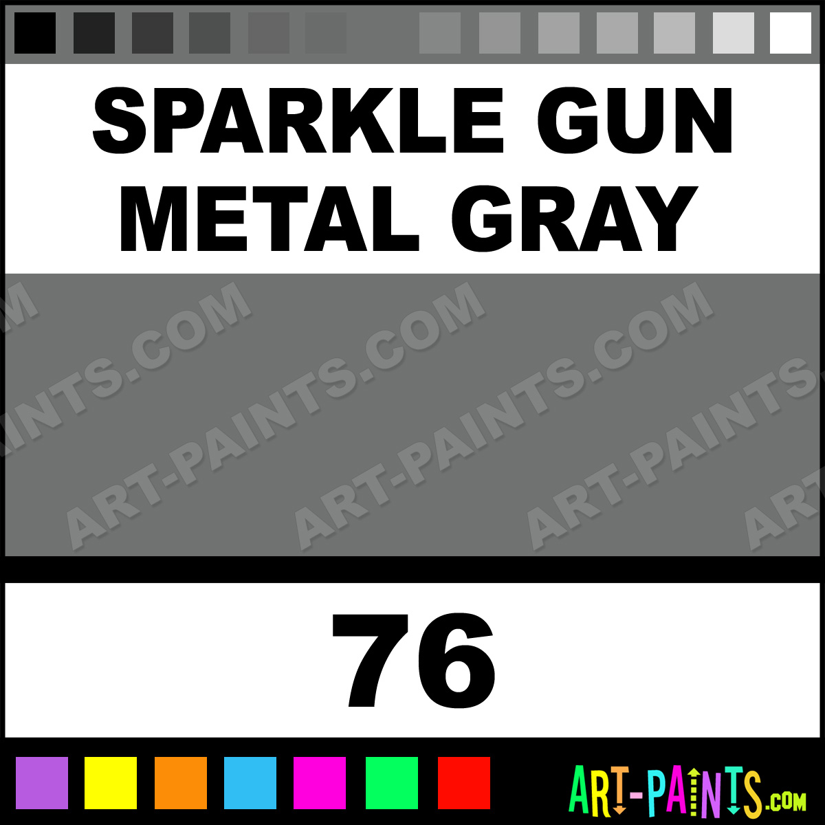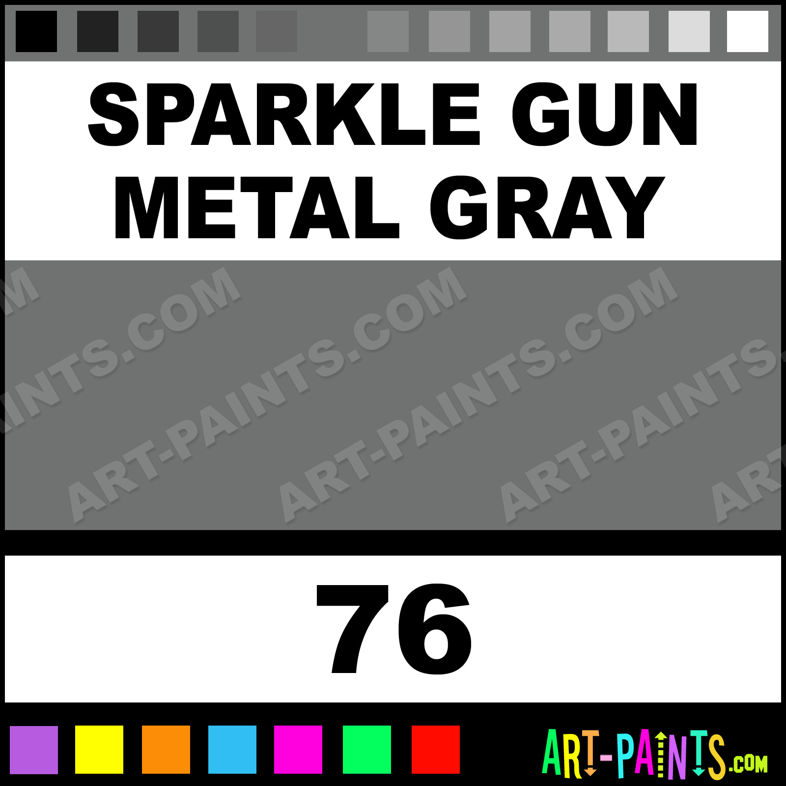This beautiful Paint Body Face shade is called Sparkle Gun Metal Gray, and comes from a company called Snazaroo. Their product number, along with the HTML color code, RGB, and CMYK codes are listed below. This Beautiful Shade of Sparkle Gun Metal Gray and others can be found in the Snazaroo Paint Art Paint Gallery! Also be sure to browse through the other wonderful Professional Color Galleries of Face Paint, Makeup, Stage, Theater and Clown Paints to see more of Snazaroo Paint Body Brand Paints and other Body and Face Paint Manufacturers. And as always, Paint Paint Paint! -Art-Paints.com