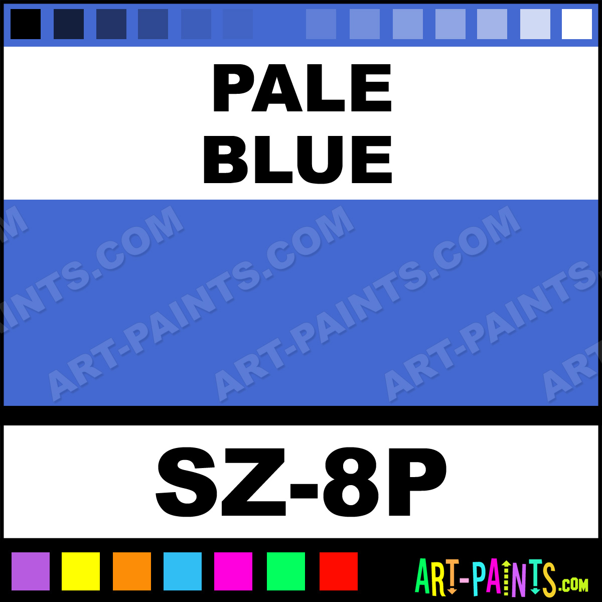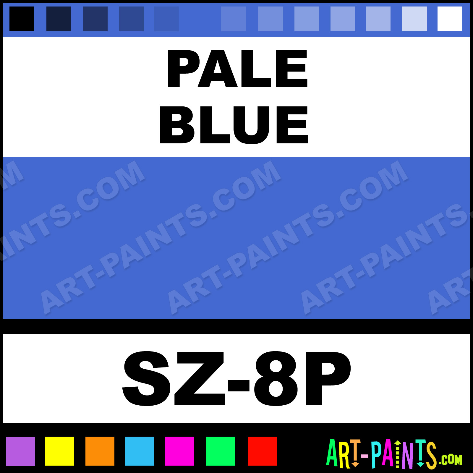This beautiful Pastel Palette Body Face shade is called Pale Blue, and comes from a company called Snazaroo. Their product number, along with the HTML color code, RGB, and CMYK codes are listed below. This Beautiful Shade of Pale Blue and others can be found in the Snazaroo Pastel Palette Art Paint Gallery! Also be sure to browse through the other wonderful Professional Color Galleries of Face Paint, Makeup, Stage, Theater and Clown Paints to see more of Snazaroo Pastel Palette Body Brand Paints and other Body and Face Paint Manufacturers. And as always, Paint Paint Paint! -Art-Paints.com