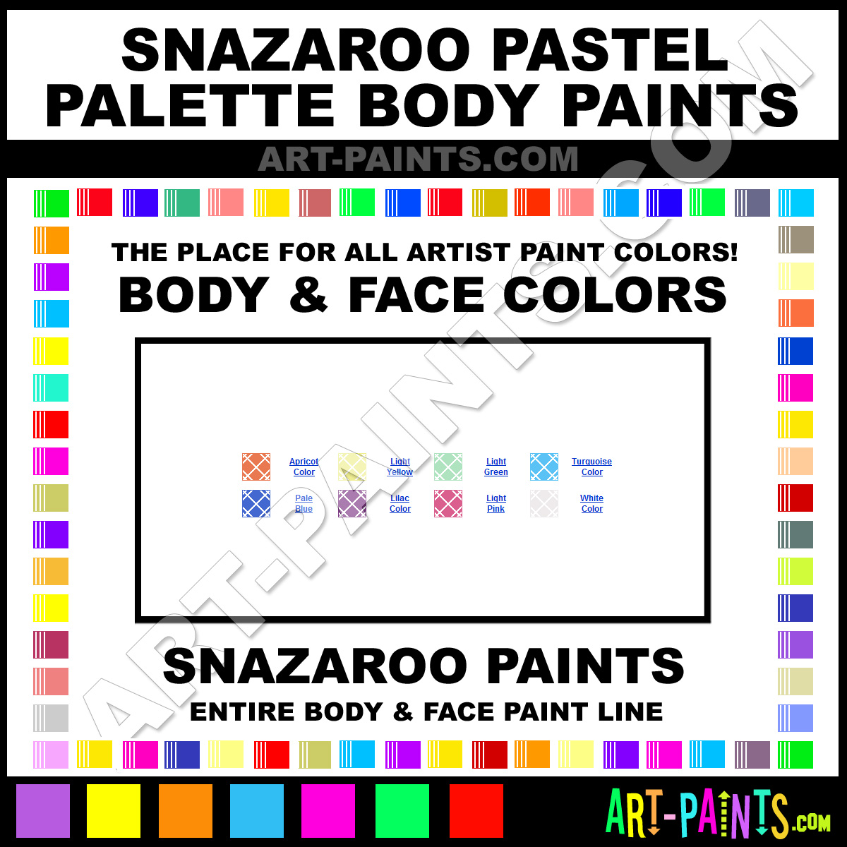 Snazaroo knows Body and Face Paints! They make a wonderful brand of paint called Snazaroo Pastel Palette Body Colors that suits all types of artists, whether they deal with Face Makeup, Body Paints, Stage and Theater Paint or even Clown Paints! They strive to perfect the process of color and are one of the most popular Body Paint Brand companies in the world. Enjoy their entire paint brand collection from the list below. Snazaroo makes wonderful Artists Body and Face Paints that everyone is sure to enjoy! Choose an Body Paint Color below to view that Hue and all their great related color paints. Paint on!     -Art-Paints.com
