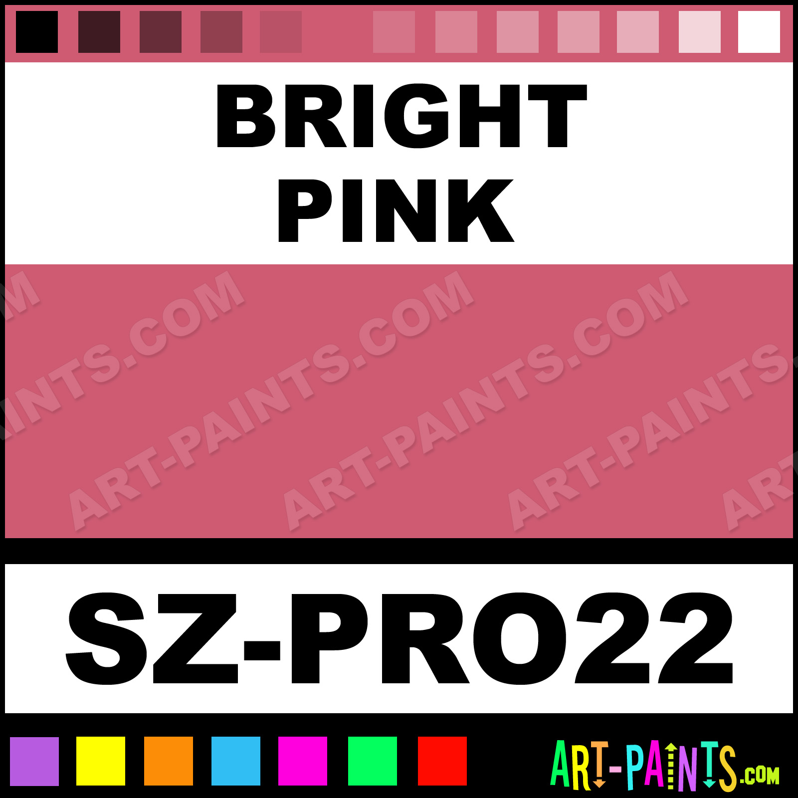 This beautiful Pro 22 Body Face shade is called Bright Pink, and comes from a company called Snazaroo. Their product number, along with the HTML color code, RGB, and CMYK codes are listed below. This Beautiful Shade of Bright Pink and others can be found in the Snazaroo Pro 22 Art Paint Gallery! Also be sure to browse through the other wonderful Professional Color Galleries of Face Paint, Makeup, Stage, Theater and Clown Paints to see more of Snazaroo Pro 22 Body Brand Paints and other Body and Face Paint Manufacturers. And as always, Paint Paint Paint! -Art-Paints.com