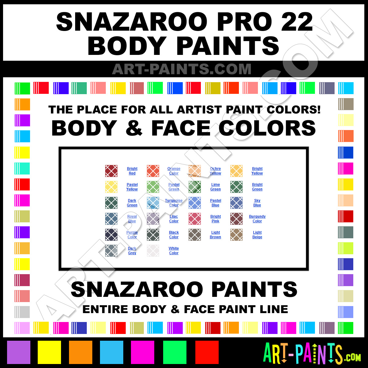 Snazaroo makes a beautiful Pro 22 Paint Brand. With a complete line of Body and Face Color Paints, 22 colors in all, available in beautiful hues and colors, they will no doubt keep you painting and smiling at the same time. This brand is very unique and exquisite!