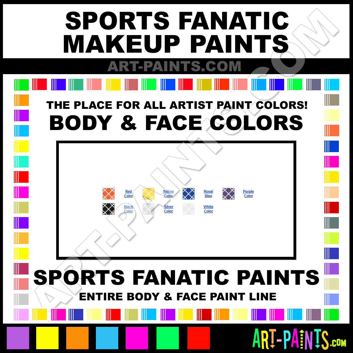 Sports Fanatic knows Body and Face Paints! They make a wonderful brand of paint called Sports Fanatic Makeup Stick Body Colors that suits all types of artists, whether they deal with Face Makeup, Body Paints, Stage and Theater Paint or even Clown Paints! They strive to perfect the process of color and are one of the most popular Body Paint Brand companies in the world. Enjoy their entire paint brand collection from the list below. Sports Fanatic makes wonderful Artists Body and Face Paints that everyone is sure to enjoy! Choose an Body Paint Color below to view that Hue and all their great related color paints.     -Art-Paints.com