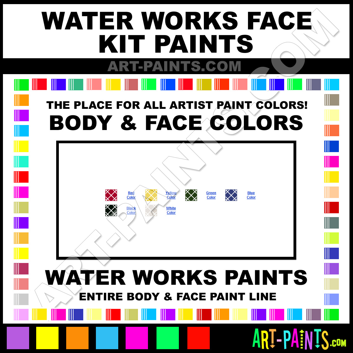 Water Works knows Body and Face Paints! They make a wonderful brand of paint called Water Works Face Kit Body Colors that suits all types of artists, whether they deal with Face Makeup, Body Paints, Stage and Theater Paint or even Clown Paints! They strive to perfect the process of color and are one of the most popular Body Paint Brand companies in the world. Enjoy their entire paint brand collection from the list below. Water Works makes wonderful Artists Body and Face Paints that everyone is sure to enjoy! Choose an Body Paint Color below to view that Hue and all their great related color paints.     -Art-Paints.com