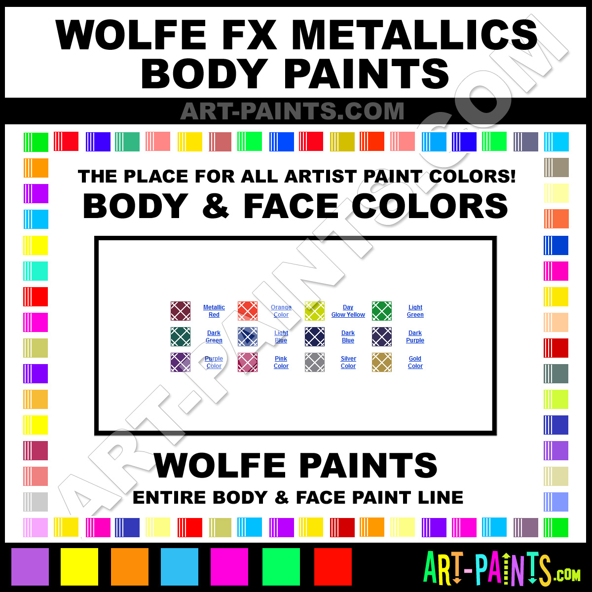 Wolfe knows Body and Face Paints! They make a wonderful brand of paint called Wolfe FX Metallics Body Colors that suits all types of artists, whether they deal with Face Makeup, Body Paints, Stage and Theater Paint or even Clown Paints! They strive to perfect the process of color and are one of the most popular Body Paint Brand companies in the world. Enjoy their entire paint brand collection from the list below. Wolfe makes wonderful Artists Body and Face Paints that everyone is sure to enjoy! Choose an Body Paint Color below to view that Hue and all their great related color paints. Paint on!     -Art-Paints.com