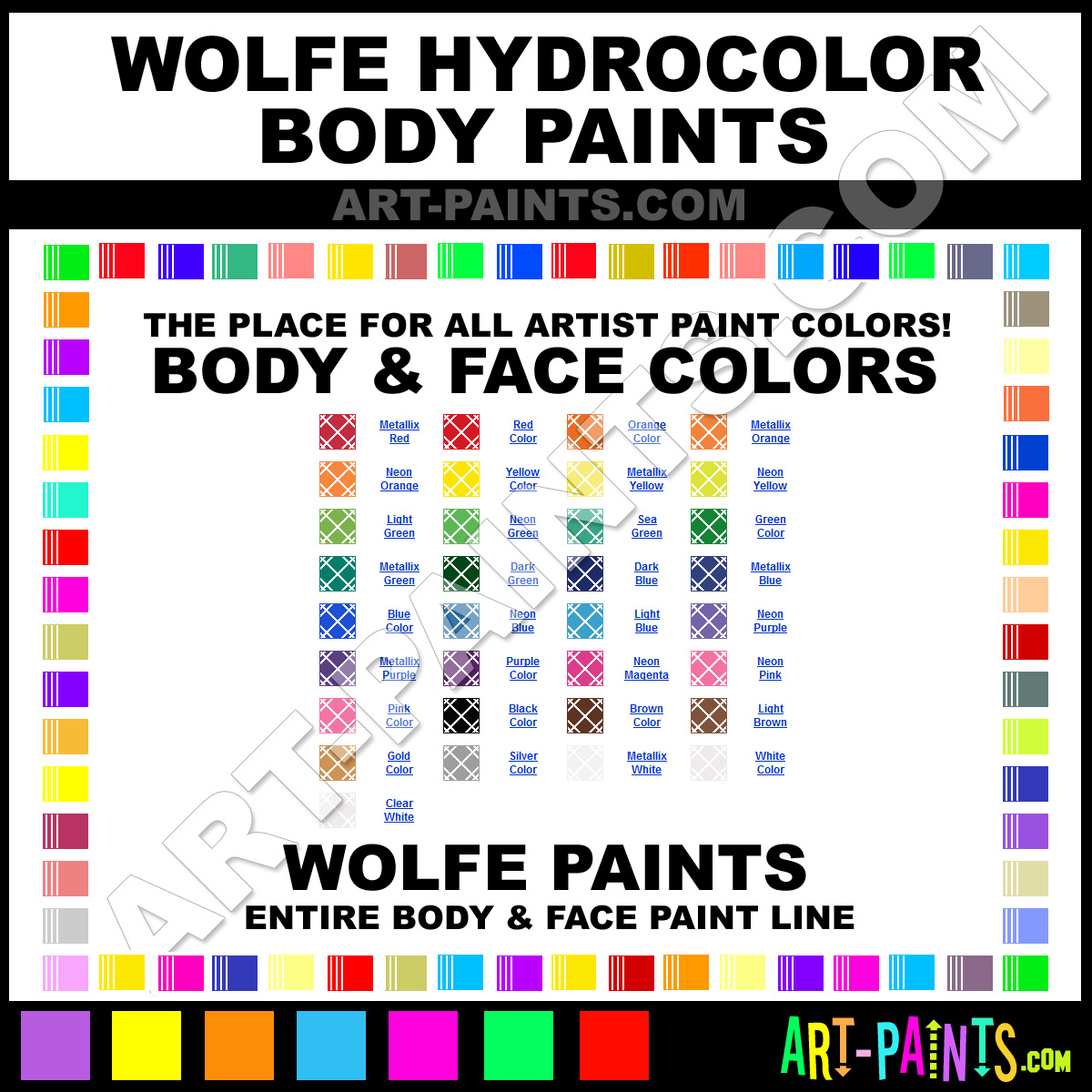 Wolfe knows Body and Face Paints! They make a wonderful brand of paint called Wolfe Hydrocolor Body Colors that suits all types of artists, whether they deal with Face Makeup, Body Paints, Stage and Theater Paint or even Clown Paints! They strive to perfect the process of color and are one of the most popular Body Paint Brand companies in the world. Enjoy their entire paint brand collection from the list below. Wolfe makes wonderful Artists Body and Face Paints that everyone is sure to enjoy! Choose an Body Paint Color below to view that Hue and all their great related color paints. Paint on!     -Art-Paints.com