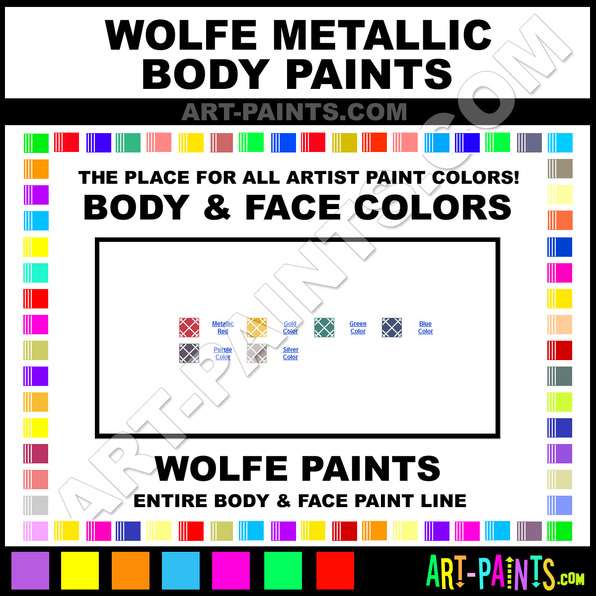 Wolfe knows Body and Face Paints! They make a wonderful brand of paint called Wolfe Metallic Body Colors that suits all types of artists, whether they deal with Face Makeup, Body Paints, Stage and Theater Paint or even Clown Paints! They strive to perfect the process of color and are one of the most popular Body Paint Brand companies in the world. Enjoy their entire paint brand collection from the list below. Wolfe makes wonderful Artists Body and Face Paints that everyone is sure to enjoy! Choose an Body Paint Color below to view that Hue and all their great related color paints. Paint on!     -Art-Paints.com
