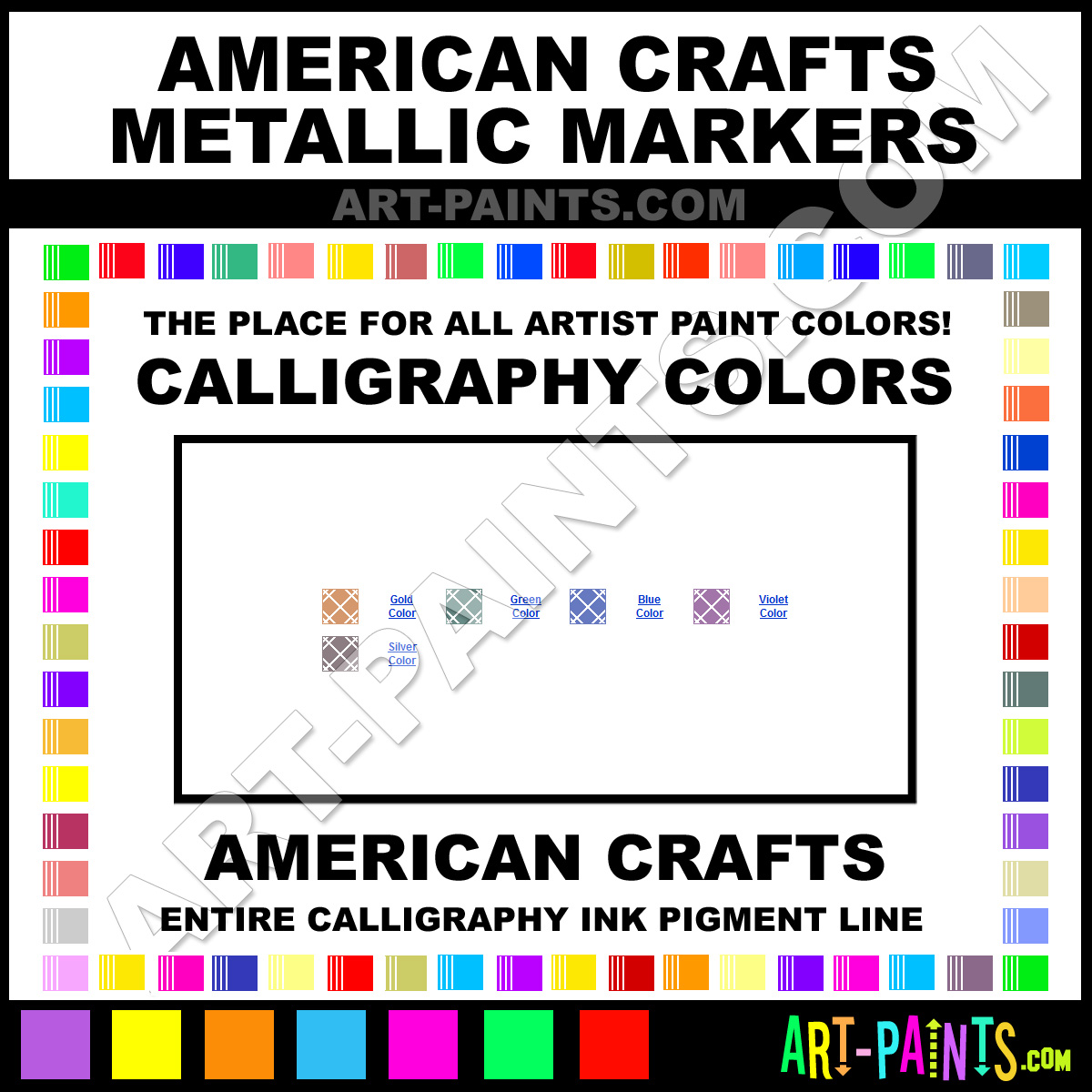 American Crafts knows Calligraphy Inks! They make a wonderful Brand of Paint called American Crafts Metallic Markers Calligraphy Colors that suits all types of Artists, great for Writing, Drawing or Painting. They strive to perfect the process of Ink, Fountain Pen Pigments and Color and are one of the most popular Calligraphy Ink companies in the World. Enjoy their entire collection below. American Crafts makes wonderful Inks that everyone is sure to enjoy! Choose a Calligraphy Ink below to view that Hue or Color!     -Art-Paints.com