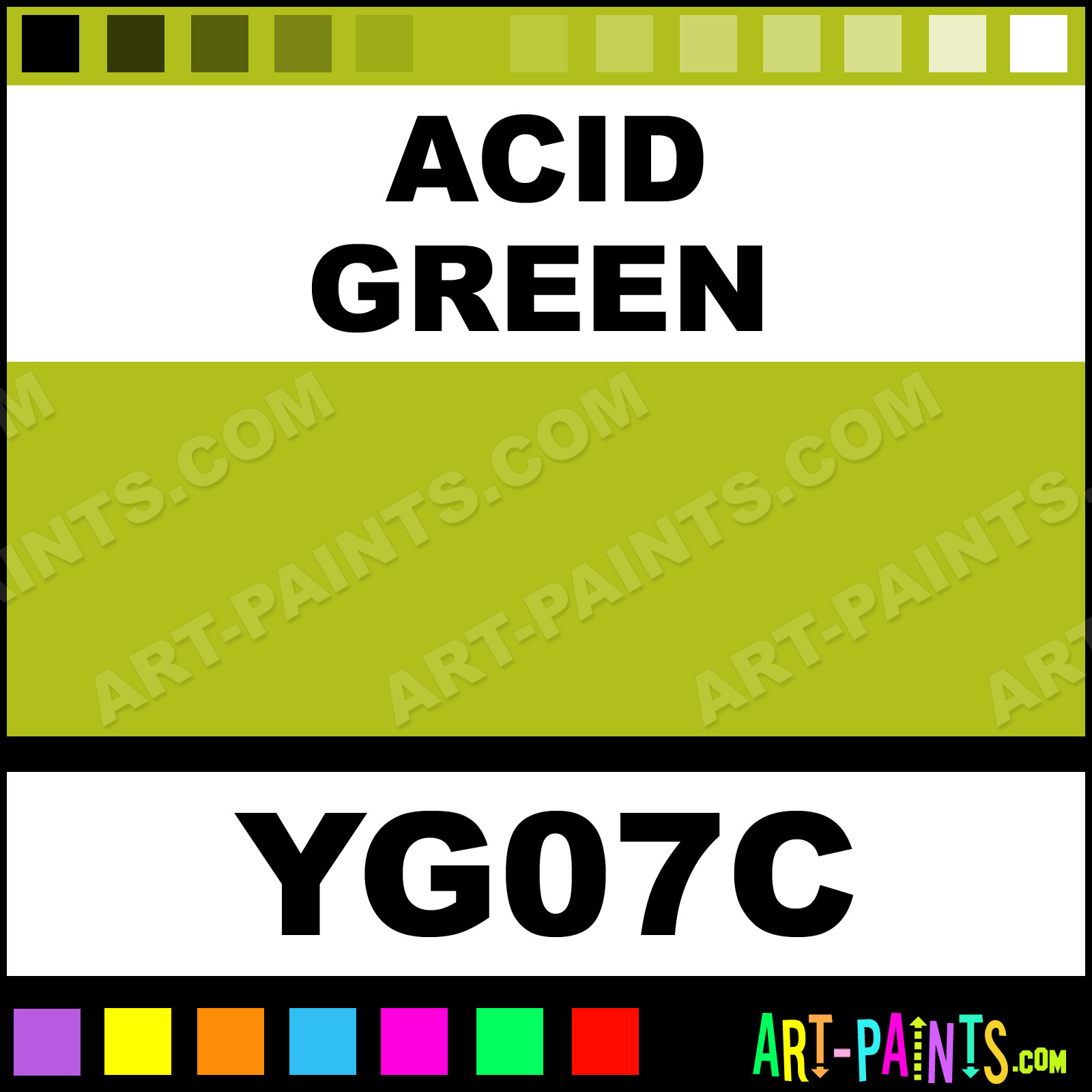 This beautiful Original Markers Calligraphy Ink Pigment shade is called Acid Green, and comes from a great company called Copic. Their product number, along with the HTML color code, RGB, and CMYK codes are listed below. This Beautiful Paint Pigment Shade of Acid Green and others can be found in the Copic Original Markers Art Ink Gallery! Be sure to browse through the other wonderful Professional Galleries to see more of Copic Original Markers Calligraphy Brand Inks and Paints and other Paint Manufacturers.   -Art-Paints.com