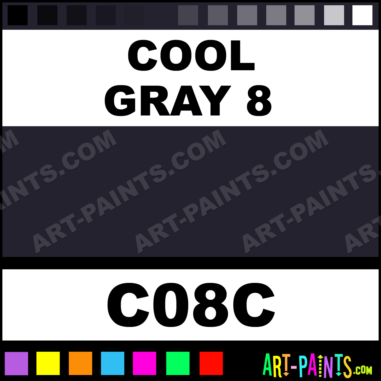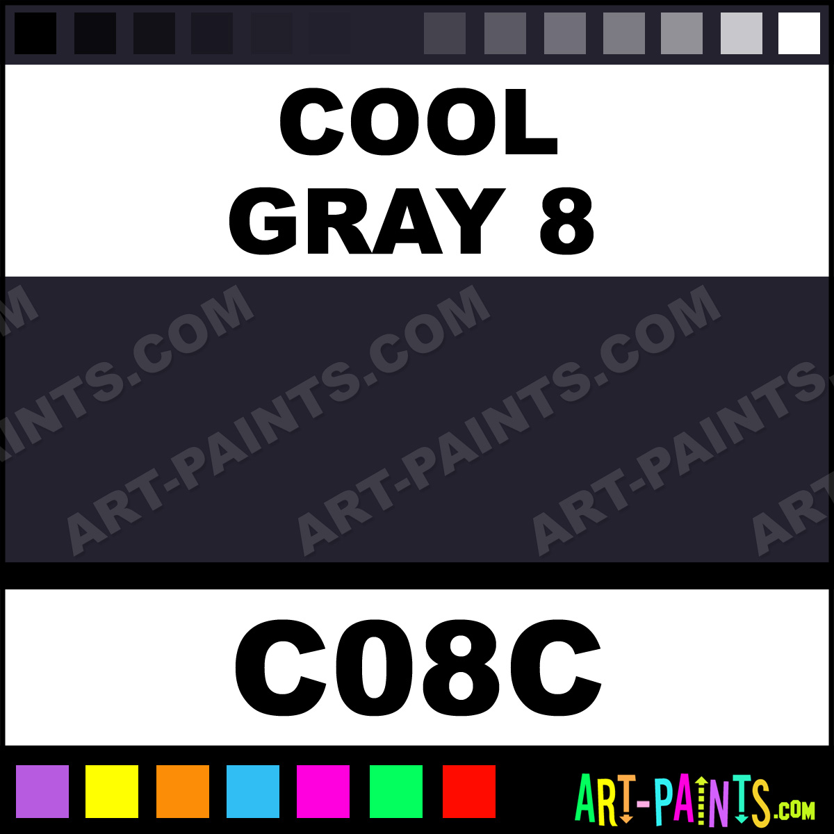 This beautiful Original Markers Calligraphy Ink Pigment shade is called Cool Gray 8, and comes from a great company called Copic. Their product number, along with the HTML color code, RGB, and CMYK codes are listed below. This Beautiful Paint Pigment Shade of Cool Gray 8 and others can be found in the Copic Original Markers Art Ink Gallery! Be sure to browse through the other wonderful Professional Galleries to see more of Copic Original Markers Calligraphy Brand Inks and Paints and other Paint Manufacturers.   -Art-Paints.com