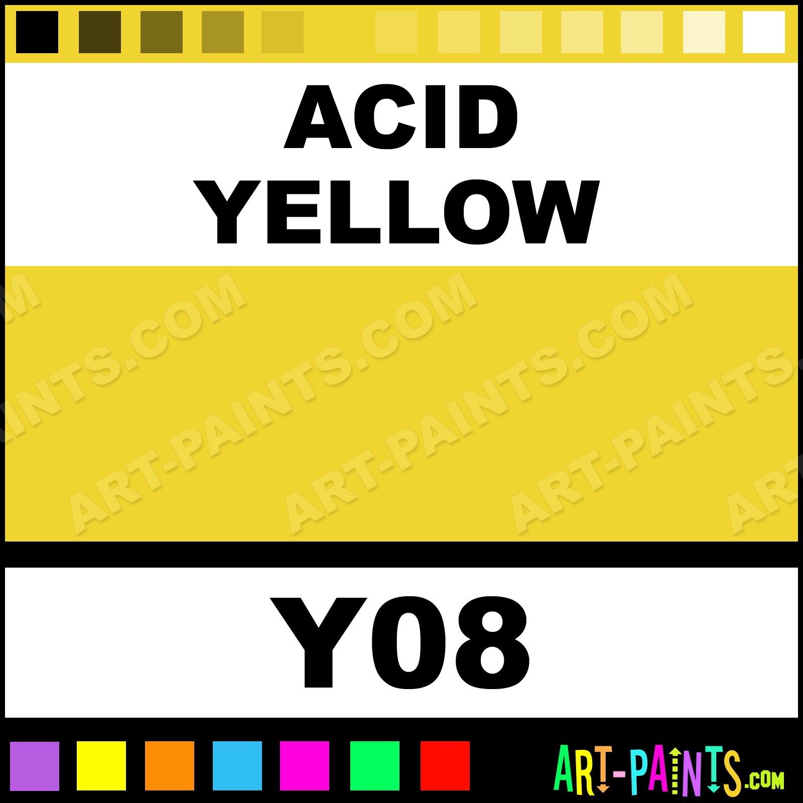 This beautiful Sketch Markers Calligraphy Ink Pigment shade is called Acid Yellow, and comes from a great company called Copic. Their product number, along with the HTML color code, RGB, and CMYK codes are listed below. This Beautiful Paint Pigment Shade of Acid Yellow and others can be found in the Copic Sketch Markers Art Ink Gallery! Be sure to browse through the other wonderful Professional Galleries to see more of Copic Sketch Markers Calligraphy Brand Inks and Paints and other Paint Manufacturers.   -Art-Paints.com