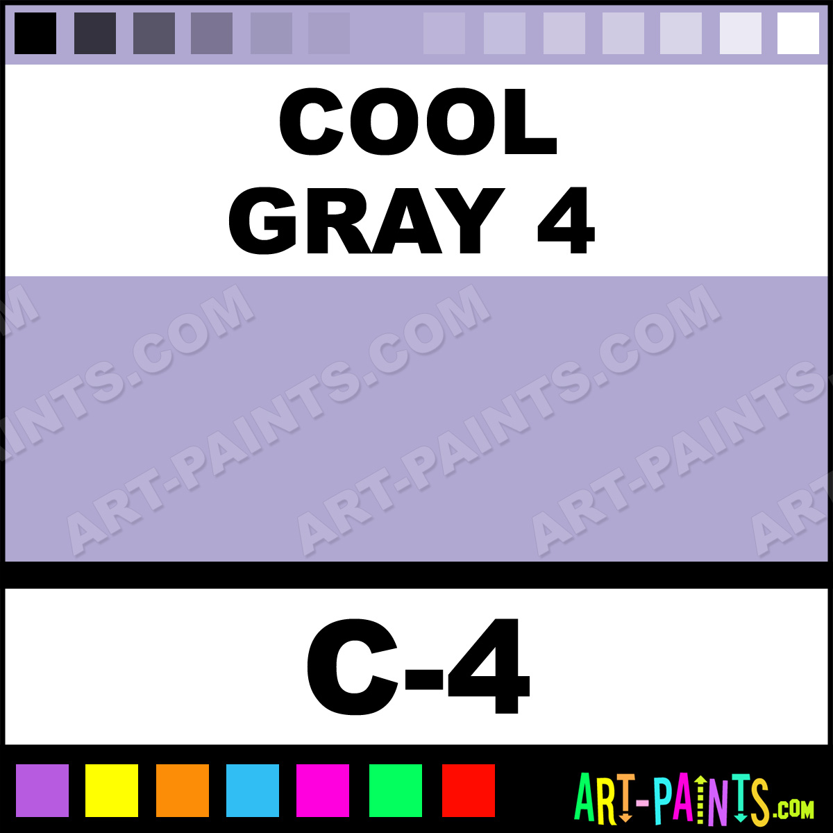 This beautiful Sketch Markers Calligraphy Ink Pigment shade is called Cool Gray 4, and comes from a great company called Copic. Their product number, along with the HTML color code, RGB, and CMYK codes are listed below. This Beautiful Paint Pigment Shade of Cool Gray 4 and others can be found in the Copic Sketch Markers Art Ink Gallery! Be sure to browse through the other wonderful Professional Galleries to see more of Copic Sketch Markers Calligraphy Brand Inks and Paints and other Paint Manufacturers.   -Art-Paints.com