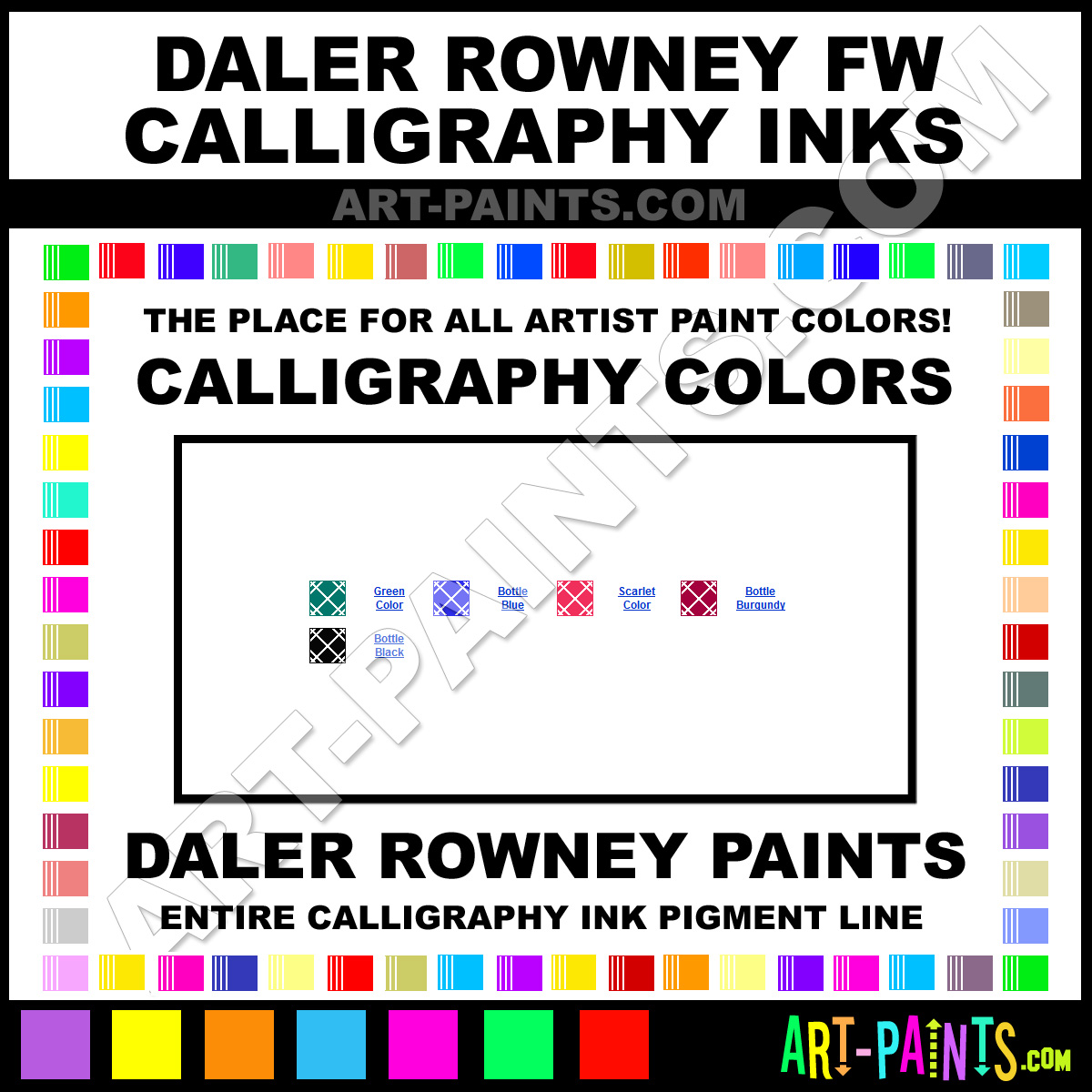 Daler Rowney knows Calligraphy Inks! They make a wonderful Brand of Paint called Daler Rowney FW Calligraphy Ink Calligraphy Colors that suits all types of Artists, great for Writing, Drawing or Painting. They strive to perfect the process of Ink, Fountain Pen Pigments and Color and are one of the most popular Calligraphy Ink companies in the World. Enjoy their entire collection below. Daler Rowney makes wonderful Inks that everyone is sure to enjoy! Choose a Calligraphy Ink below to view that Hue or Color!     -Art-Paints.com
