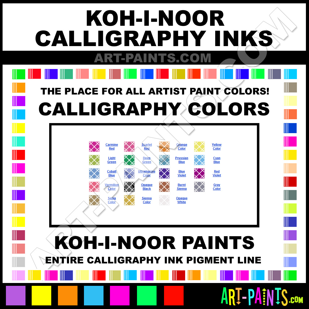 Koh-I-Noor knows Calligraphy Ink Paints & Pigments! They make wonderful Brands of Paint for all types of Artists. They strive to perfect the process of color and are one of the most popular Calligraphy Ink Paint Brand companies in the World. Enjoy their entire collection below. Koh-I-Noor makes a couple different types of Calligraphy Paint Brands including its Drawing Ink Inks and its Trans Mix Media Ink Pigment Paints! Choose a Calligraphy Ink type below to view that Brand and Colors and Hues!     -Art-Paints.com