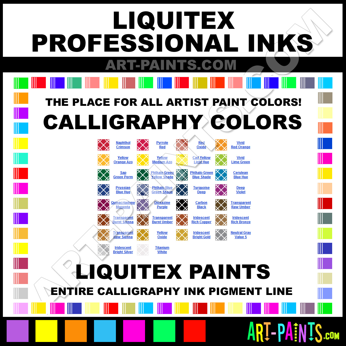 Liquitex knows Calligraphy Inks! They make a wonderful Brand of Inks & Pigments called Liquitex Professional Ink Calligraphy Ink Colors that suits all types of Artists for either Writing, Drawing or Painting. They strive to perfect the process of color and are one of the most popular Calligraphy Paint Brand companies in the World. Enjoy their entire Ink and Pigment Paint collection from the list below. Liquitex makes wonderful Artists Pigments that everyone is sure to enjoy! Choose a Calligraphy Ink Paint below to view that Hue, Tone or Color!     -Art-Paints.com
