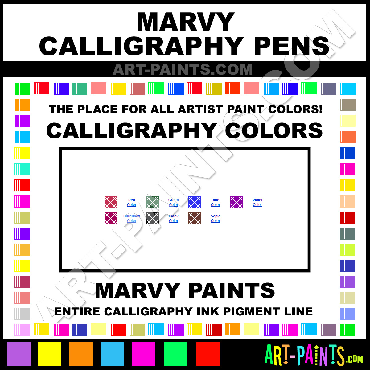 Marvy knows Calligraphy Ink Paints & Pigments! They make wonderful Brands of Paint for all types of Artists. They strive to perfect the process of color and are one of the most popular Calligraphy Ink Paint Brand companies in the World. Enjoy their entire collection below. Marvy makes a couple different types of Calligraphy Paint Brands including its 6000 Pens, DecoColor Markers and its Metallic Markers Pigment Paints! Choose a Calligraphy Ink type below to view that Brand and Colors and Hues!     -Art-Paints.com
