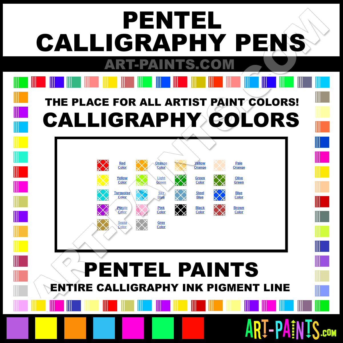 Pentel knows Calligraphy Ink Paints & Pigments! They make wonderful Brands of Paint for all types of Artists. They strive to perfect the process of color and are one of the most popular Calligraphy Ink Paint Brand companies in the World. Enjoy their entire collection below. Pentel makes a couple different types of Calligraphy Paint Brands including its Brush Pens Inks and its Metallic Brush Pens Pigment Paints! Choose a Calligraphy Ink type below to view that Brand and Colors and Hues!     -Art-Paints.com