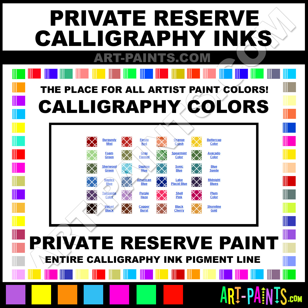 Private Reserve knows Calligraphy Inks! They make a wonderful Brand of Inks & Pigments called Private Reserve Ink Calligraphy Ink Colors that suits all types of Artists for either Writing, Drawing or Painting. They strive to perfect the process of color and are one of the most popular Calligraphy Paint Brand companies in the World. Enjoy their entire Ink and Pigment Paint collection from the list below. Private Reserve makes wonderful Artists Pigments that everyone is sure to enjoy! Choose a Calligraphy Ink Paint below to view that Hue, Tone or Color!     -Art-Paints.com