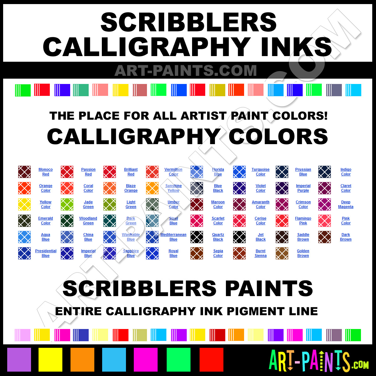 Scribblers knows Calligraphy Inks! They make a wonderful Brand of Inks & Pigments called Scribblers Ink Calligraphy Ink Colors that suits all types of Artists for either Writing, Drawing or Painting. They strive to perfect the process of color and are one of the most popular Calligraphy Paint Brand companies in the World. Enjoy their entire Ink and Pigment Paint collection from the list below. Scribblers makes wonderful Artists Pigments that everyone is sure to enjoy! Choose a Calligraphy Ink Paint below to view that Hue, Tone or Color!     -Art-Paints.com