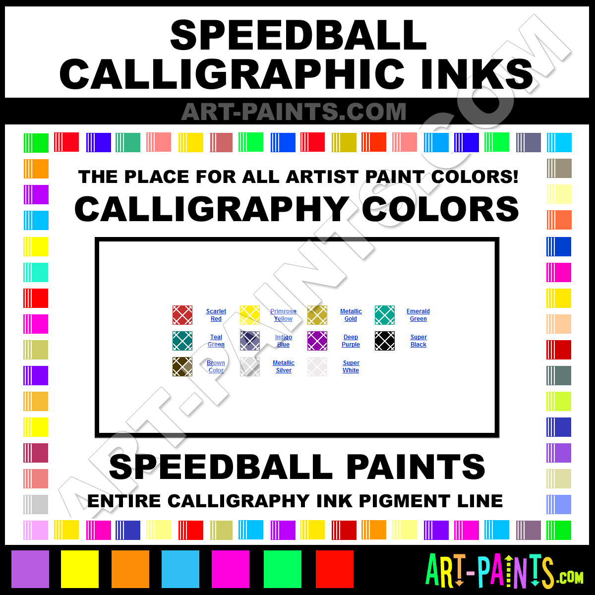 Speedball knows Calligraphy Ink Paints & Pigments! They make wonderful Brands of Paint for all types of Artists. They strive to perfect the process of color and are one of the most popular Calligraphy Ink Paint Brand companies in the World. Enjoy their entire collection below. Speedball makes a couple different types of Calligraphy Paint Brands including its Inks Inks and its Pigmented Acrylic Ink Pigment Paints! Choose a Calligraphy Ink type below to view that Brand and Colors and Hues!     -Art-Paints.com