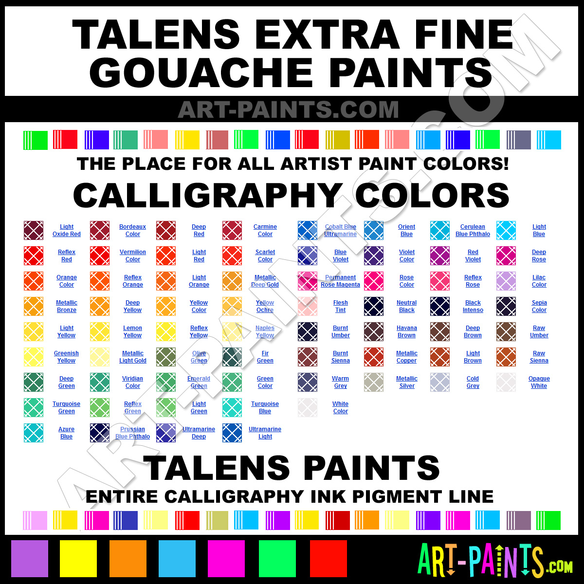 Talens knows Calligraphy Inks! They make a wonderful Brand of Inks & Pigments called Talens Extra Fine Gouache Calligraphy Ink Colors that suits all types of Artists for either Writing, Drawing or Painting. They strive to perfect the process of color and are one of the most popular Calligraphy Paint Brand companies in the World. Enjoy their entire Ink and Pigment Paint collection from the list below. Talens makes wonderful Artists Pigments that everyone is sure to enjoy! Choose a Calligraphy Ink Paint below to view that Color!     -Art-Paints.com