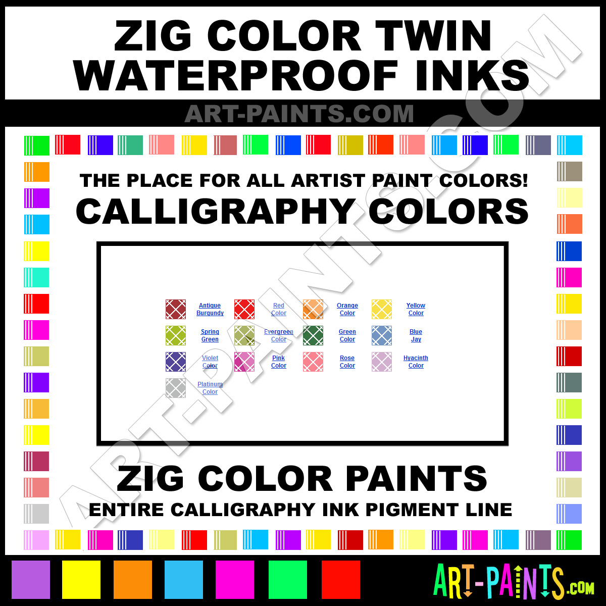 Zig Color knows Calligraphy Inks! They make a wonderful Brand of Inks & Pigments called Zig Color Twin Waterproof Calligraphy Ink Colors that suits all types of Artists for either Writing, Drawing or Painting. They strive to perfect the process of color and are one of the most popular Calligraphy Paint Brand companies in the World. Enjoy their entire Ink and Pigment Paint collection from the list below. Zig Color makes wonderful Artists Pigments that everyone is sure to enjoy! Choose a Calligraphy Ink Paint below to view that Hue, Tone or Color!     -Art-Paints.com