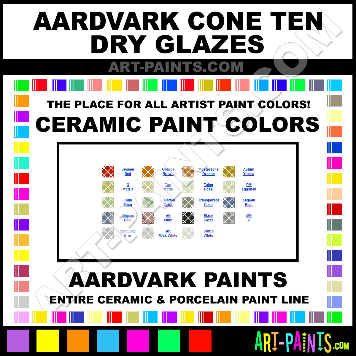 Aardvark makes a beautiful Cone Ten Dry Glazes Paint Brand. With a complete line of Ceramic Color Paints, 19 colors in all, available in beautiful hues and colors, they will no doubt keep you painting and smiling at the same time. Whether you use these Paints for Porcelain, Glass, Tile, Pottery, Bisque, Greenware, Glazes or Stains, this brand is very unique and exquisite!