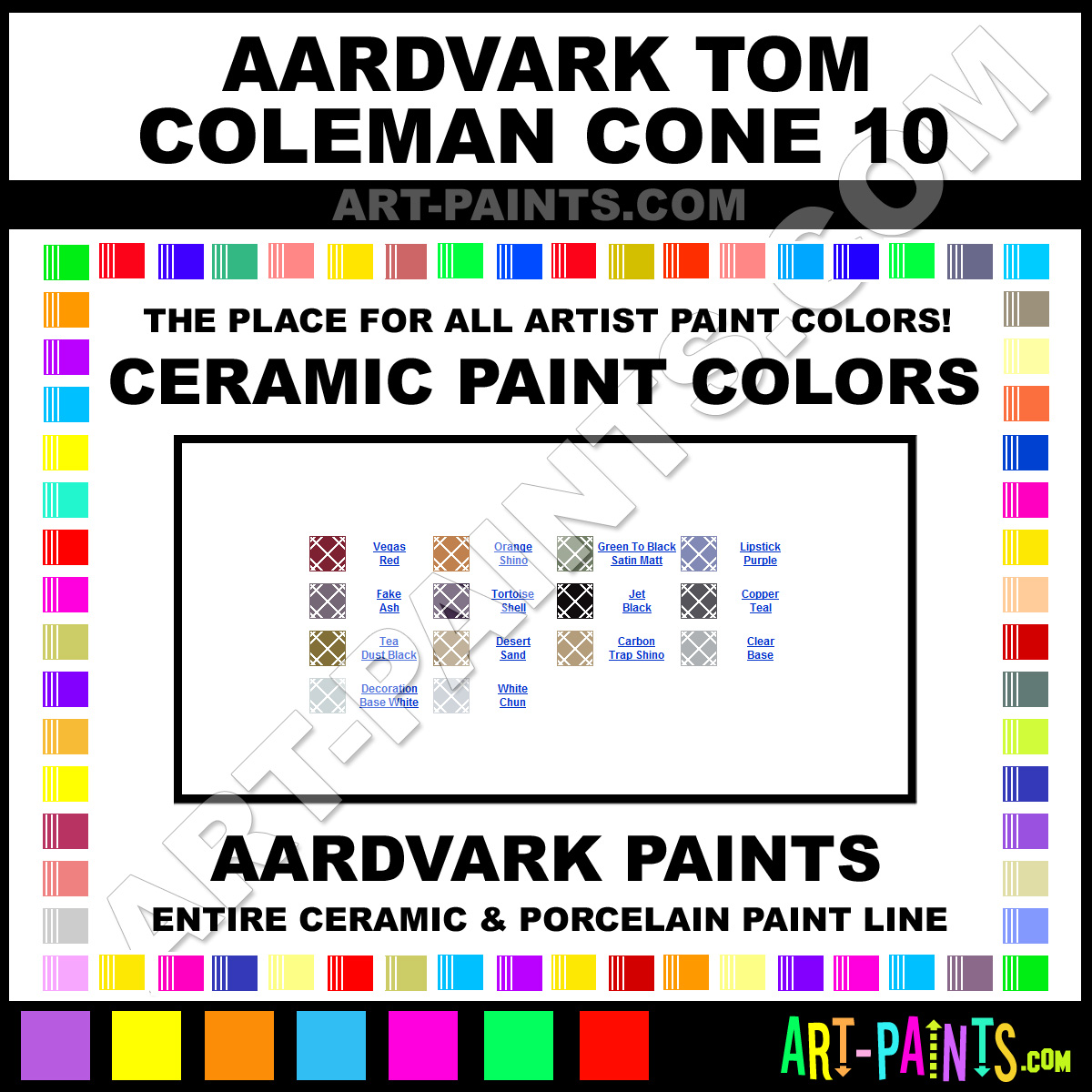 Aardvark makes a beautiful Tom Coleman Cone 10 Paint Brand. With a complete line of Ceramic Color Paints, 14 colors in all, available in beautiful hues and colors, they will no doubt keep you painting and smiling at the same time. Whether you use these Paints for Porcelain, Glass, Tile, Pottery, Bisque, Greenware, Glazes or Stains, this brand is very unique and exquisite!